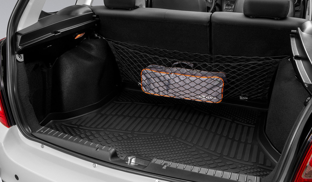 В салоне главная изюминка — комбинированная обивка сидений специальной водооталкивающей тканью и искусственной кожей (такой материал применяется на автомобилях LADA впервые). В багажнике уложен резиновый коврик и закреплены багажных сетки: одна фиксирует груз по горизонтали, а вторая представляет собой карман на спинке заднего дивана.