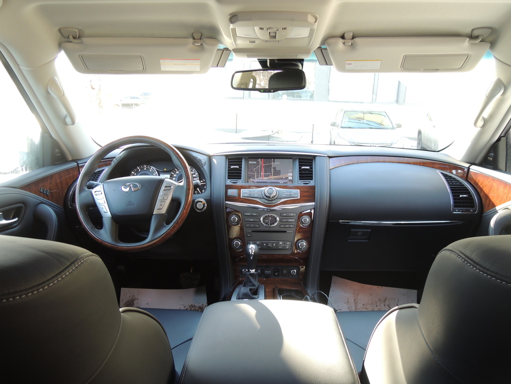 Про интерьер вообще отдельная песня. Если в предшественнике еще можно было легко найти огрехи в виде откровенно дешевых пластиковых элементов и «псевдодеревянных» вставок не самого лучшего качества, то в обновленном автомобиле такого нет и в помине. Теперь практически все, что можно обтянуто кожей, а пластик если и присутствует, то он — прорезиненный, мягкий на ощупь. Таким образом, интерьер выглядит строго и стильно, ничего не скрипит и не трещит, что вкупе с хорошей шумоизоляцией создает дополнительное ощущение комфорта. Любителям хорошей музыки наверняка придется по вкусу проверенная временем аудиосистема от американской компании Bose с весьма недурственным звучанием, а четырехзонный климат-контроль не даст ни водителю, ни его пассажирам замерзнуть зимой или перегреться летом. Да и с сенсорным дисплеем, на который выводятся показатели меню автомобиля, камер кругового обзора, бортового компьютера и прочая полезная информация, разобраться не представляет никакого труда. Разве что с меню навигации придется помучиться, кажется, что Infiniti здесь пытается поспорить с конкурентом из Lexus, у кого из них оно получится «замороченнее». Но такие мелочи — вопрос привычки и некоторого времени, а многие современные автомобилисты и вовсе пользуется навигацией, встроенной в подавляющее большинство моделей смартфонов. Традиционные аналоговые часы расположились строго по середине торпедо, что лишний раз подчеркивает солидность и строгость интерьера, а также социальный статус владельца. Честно говоря, придраться к внутреннему убранству QX80 практически невозможно, посетовать можно разве что на слишком мелкие кнопочки управления стереосистемой, круиз-контролем и бортовым компьютером, расположенные на руле. Но последнее — стопроцентная придирка...