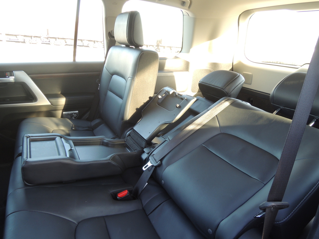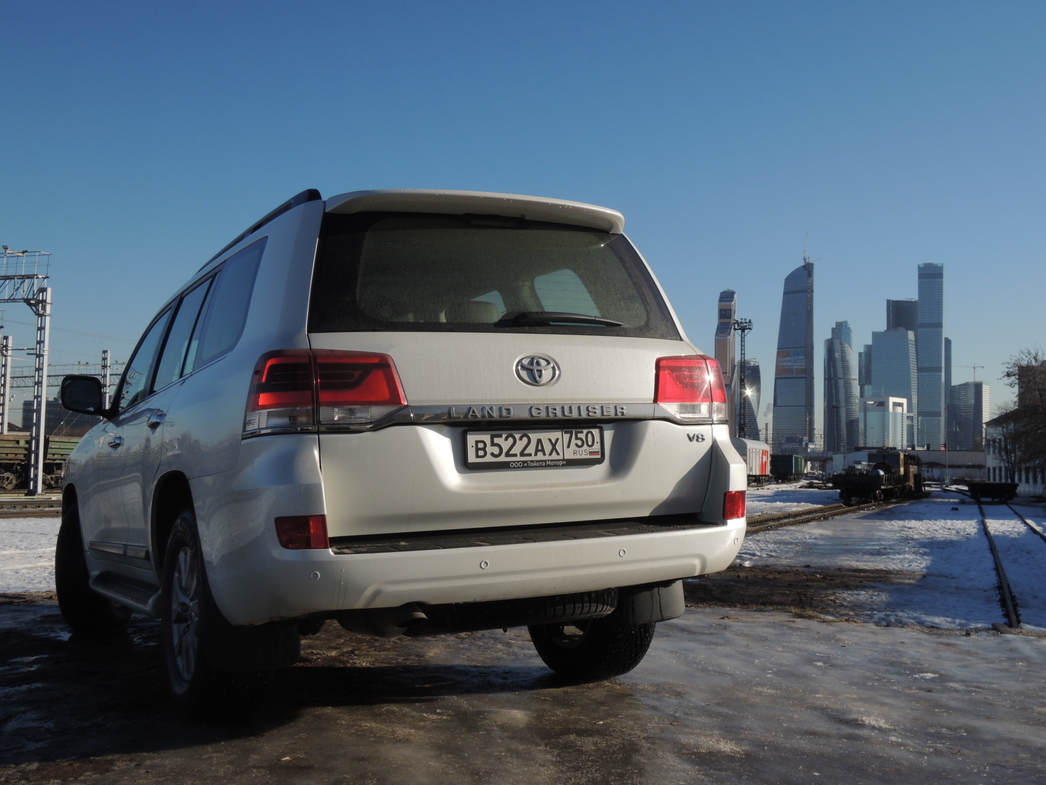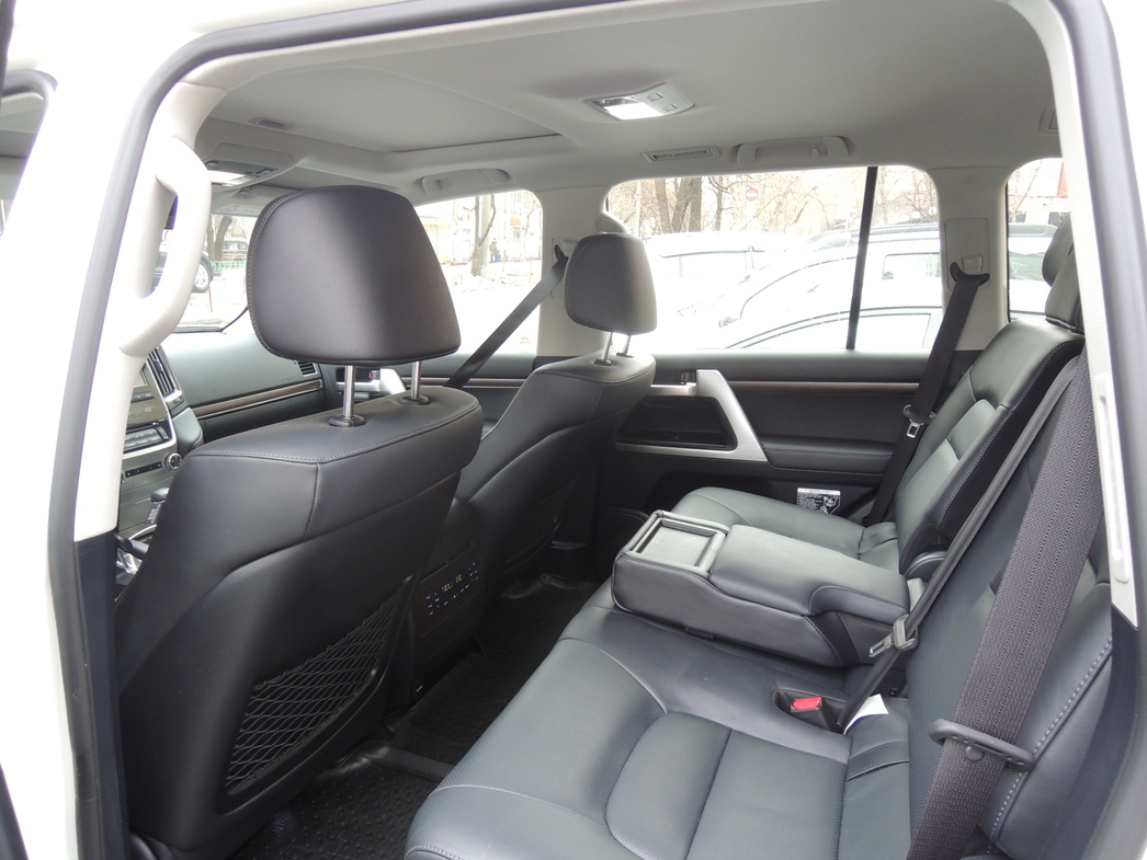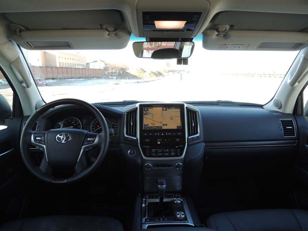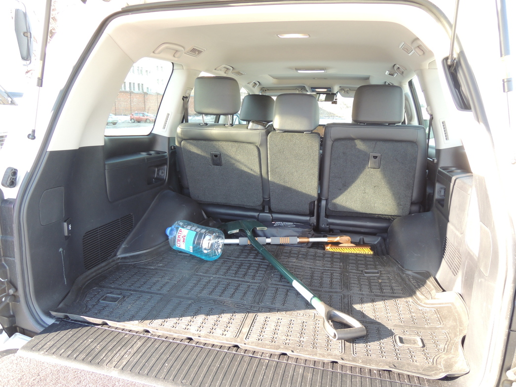 Внутри могучего Land Cruiser все крупное и монолитное, посадка высокая, но в то же время глубокая, так что дотянуться до ручки пассажирской двери, например, крайне непросто. Исполинские боковые зеркала обеспечивают превосходную обзорность. Задняя дверь, разумеется, снабжена электроприводом, а багажник такого размера, что заботливо положенная кем-то совковая лопата теряется в нем словно спичка. Да в такой отсек войдет половина супермаркета. А если еще и задние сиденья сложить...