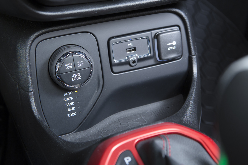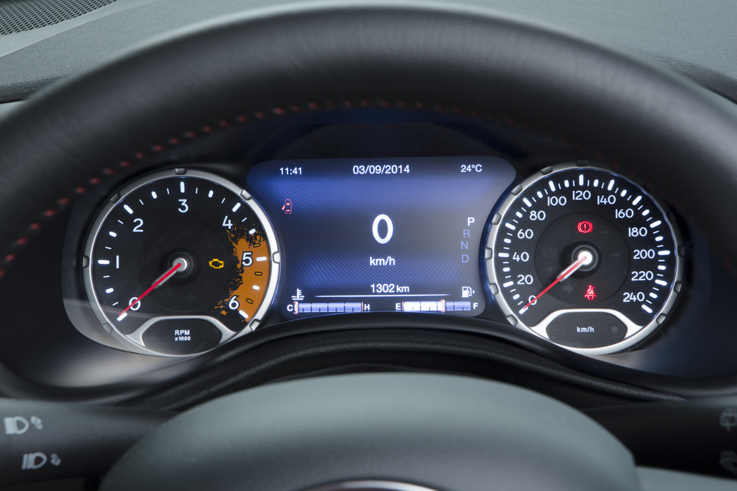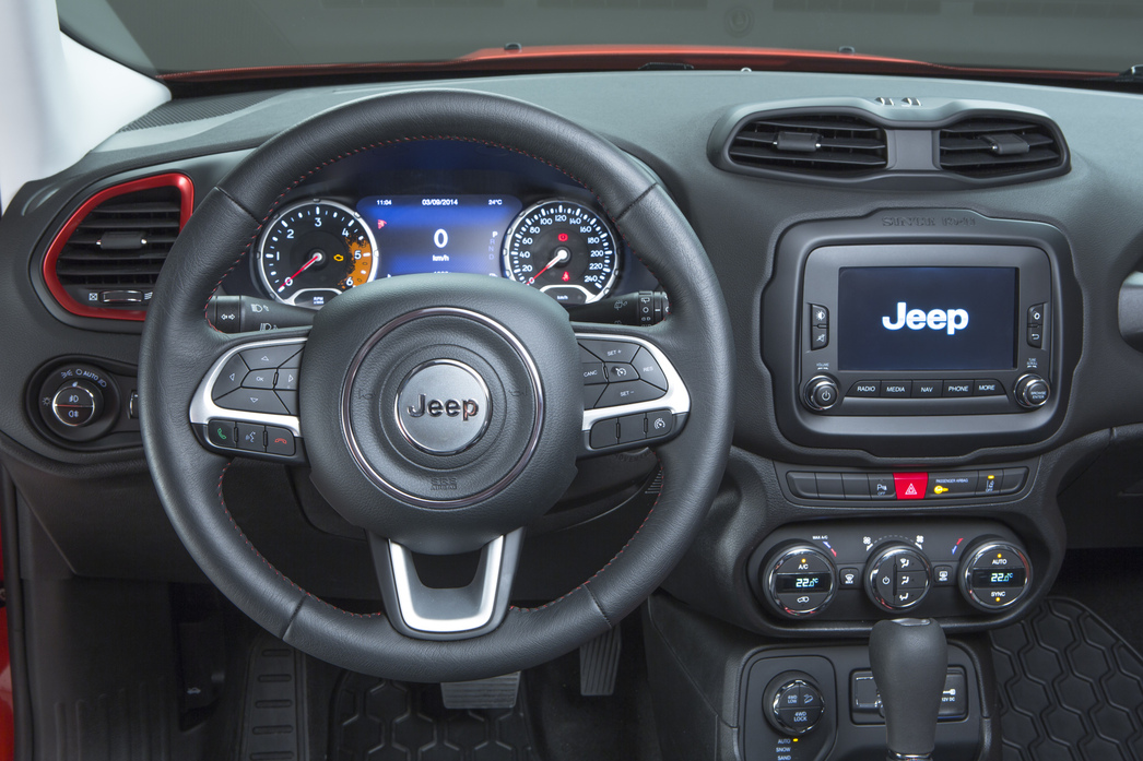 Дизайнер интерьера Renegade явно намеревался слегка похихикать над внедорожным пафосом марки Jeep. Эти многоугольники, под которые стилизованы практически все крупные части интерьера, – воздуховоды, подстаканники «пьедестал» селектора АКП, блок управления климатом и т.д., – выглядят вроде бы по-взрослому, но при этом абсолютно несерьезно. Как запчасти от какого-то мультяшного робота, нарисованного для детей дошкольного возраста. Этакая «брутальность со смешинкой». Лишь оформление приборной доски выпадает из общей стилистики. Но выпадет органично, глаз не цепляется. Тут прекрасно соседствуют аналоговые циферблаты и цветной экран бортового компьютера по центру. На него, помимо стандартного набора данных о состоянии машины, скорости и т.п., можно выводить показания «навигации» или текущее распределение тяги по осям.