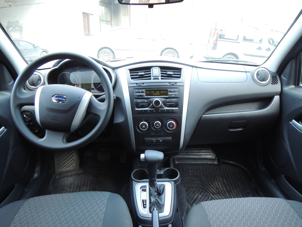 Внутри же все так, как и подобает бюджетному автомобилю — абсолютно «дубовый», почти каменный, пластик и имплантированные элементы от Renault Logan и ему подобных продуктов альянса Renault-Nissan. Зато крышка багажника «отстреливается» кнопкой, впрочем, так же, как и в родственной LADA Granta. А вообще, в двух словах, об интерьере машины можно сказать следующее: бедненько конечно, но чистенько. Опять же повторюсь, что никакого «Ах!» никто и не ожидал, так что все вполне предсказуемо — обычный кондиционер, какая-то музыка и даже SD-карту и USB шнур воткнуть можно. Приборная панель читается не очень — слишком мелкие шкалы и цифры, да и бликует она на солнце так, что порой просто ничего не видно.