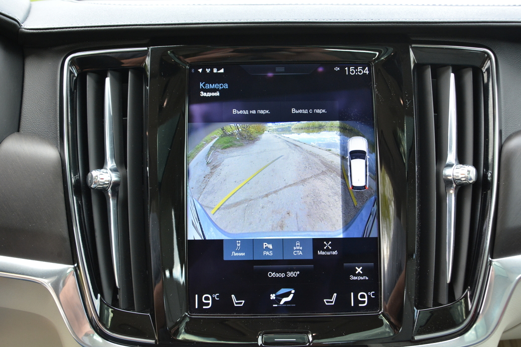 Но не будем о грустном и переберемся в салон нашего «премиального сарая». В интерьере, как и в любой современной Volvo, присутствуют два экрана: монитор электронной приборной доски и 9-дюймовый «планшетник», заменивший собой все, что в прочих машинах называется «центральная консоль». На этот «тач-скрин» выведены практически все функции управления системами машины — от ассистентов вождения до навигации, мультимедийных штучек (действительно впечатляющих) и климат-контроля. Кнопки-крутилки сохранились в самом минимальном количестве: на руле да на потолке — управляющие люком и шторкой огромной панорамной крыши. Ну и между передних сидений, рядом с селектором 8-ступенчатой АКП, пристроились поворотный тумблер запуска двигателя да «валик» выбора режимов движения.