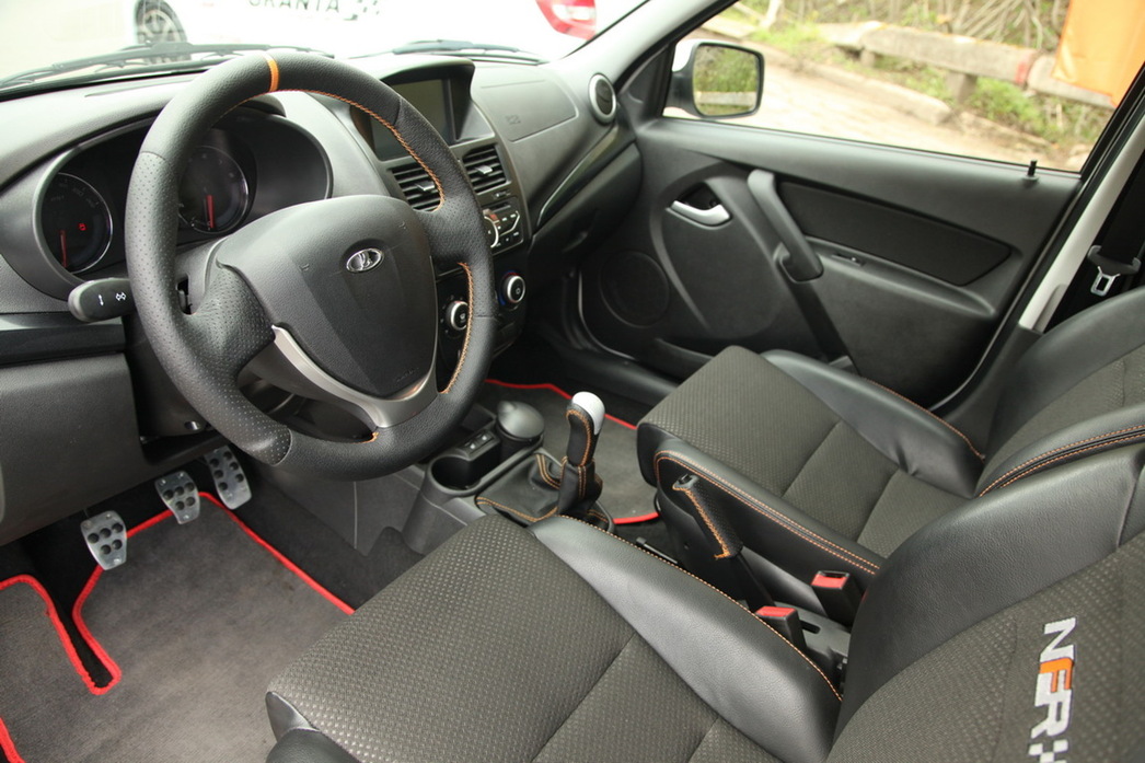 При этом LADA Kalina NFR — самая «злая» из серийных оспортивленных машин АВТОВАЗа (о гоночных способностях и умениях LADA Kalina Sport и LADA можно прочитать здесь). Спортивный обвес приятен глазу. Все эти спойлера, юбки, заниженный до 147 мм дорожный просвет, воздухозаборники на капоте — просто ах! Точнее, вах!
