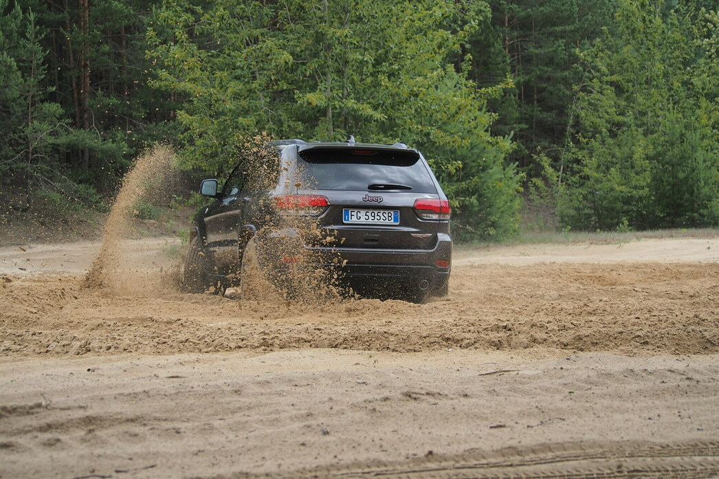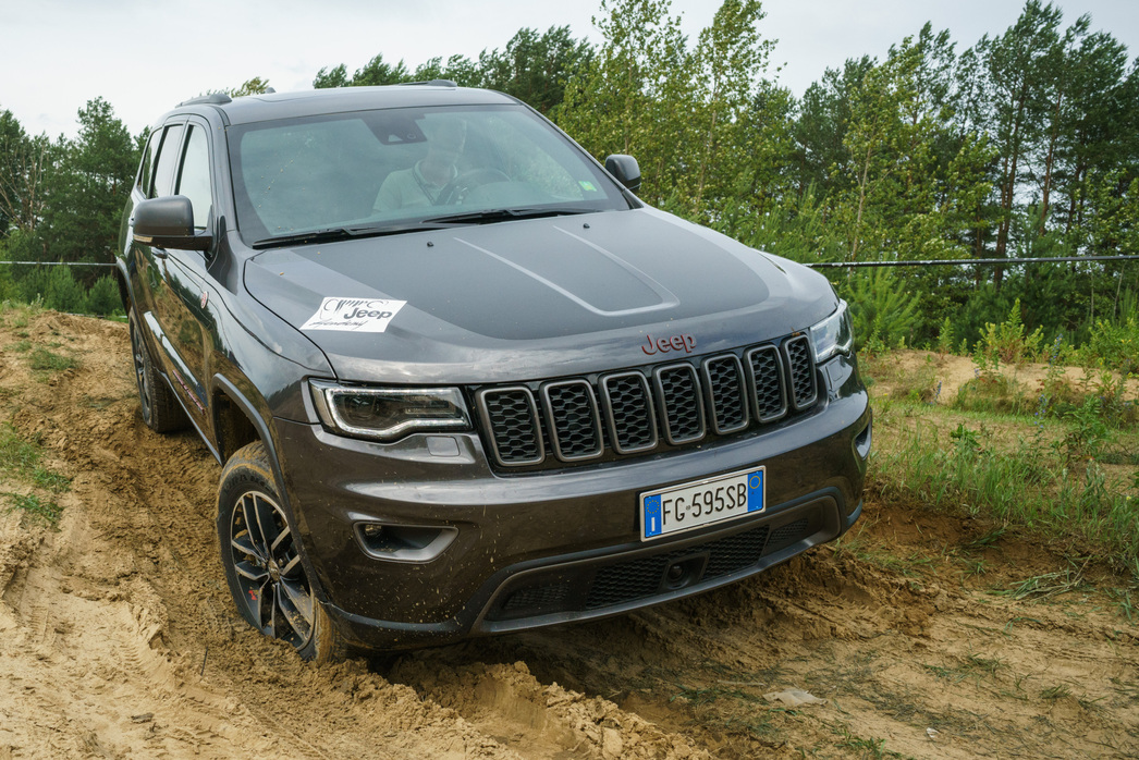 Впереди глубочайшая колея, которую ни с какой стороны не объедешь — мешают кусты. В ход идет клавиша, управляющая величиной клиренса. Дорожный просвет у Trailhawk при желании можно увеличить с 205 до 274 мм. Пройти упражнение на диагональное вывешивание для «Гранда» также плевое дело: система Quadra-Drive II с электронной блокировкой дифференциала справляется с ним на раз. Я, сидя в машине, даже и не чувствую, как правое заднее колесо отрывается от земли чуть ли не на полметра. Мне кажется, что джип лишь слегка раскачивается на неровностях трассы как на волнах.