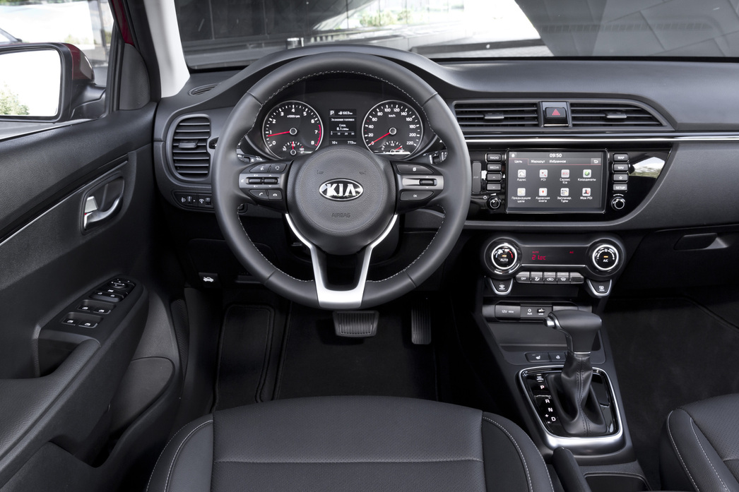 Натереть мозоли на коленях о спинку впереди стоящего кресла, испортить прическу крышей или наоборот — это больше не про KIA Rio. Как, впрочем, ушло в прошлое и аскетичное оформление салона. Модные черные глянцевые вставки, разбавленные хромом, элегантная линия, разрезающая торпедо на две части, мультифункциональный трехспицевый руль — они мгновенно бросаются в глаза, как только погружаешься в глубокое и в меру мягкое кресло, отделанное кожей. Да-да, мы не описались — корейцы предложили российским покупателям несвойственный «бюджетникам» кожаный салон!