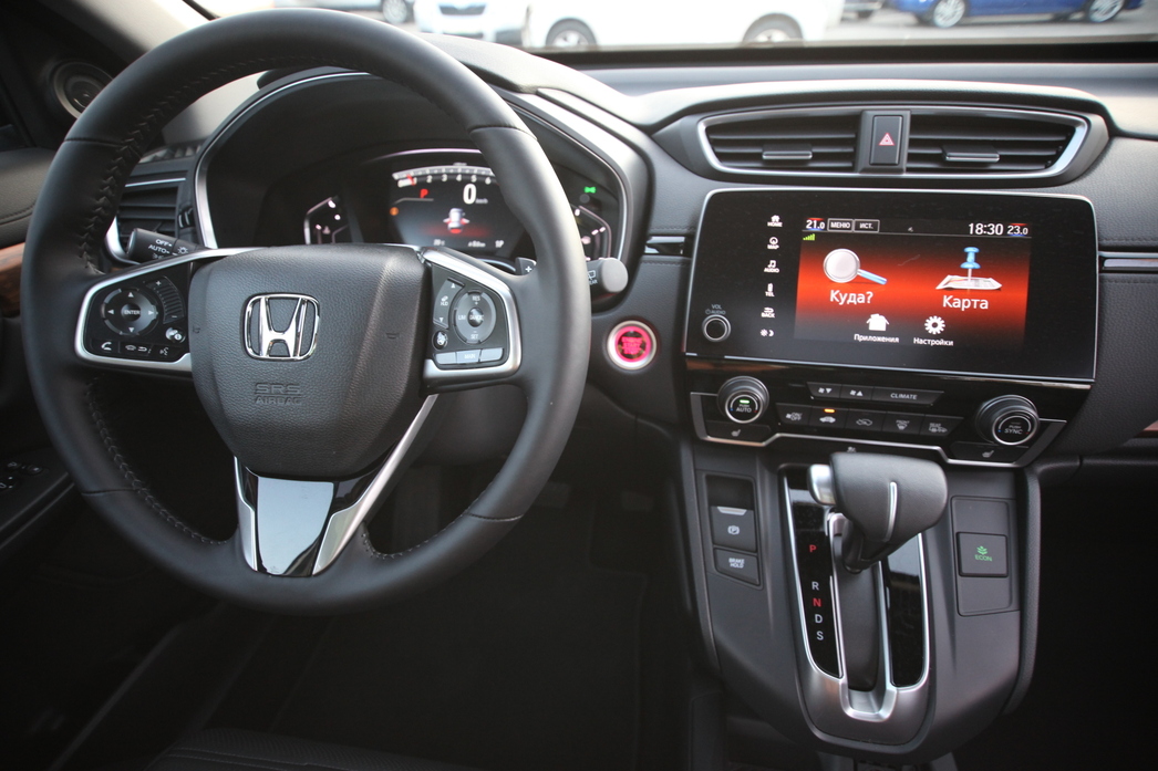 Салон новой модели в общих чертах напоминает прежние апартаменты CR-V, где функциональность удачно вписывается в рамки консервативного стиля. Хотя в деталях заметны существенные изменения. Например, панель приборов теперь электронная, с качественной цветной графикой. Имеется также регулируемый проекционный дисплей, позволяющий не отвлекаться от дороги. На центральной консоли размещен планшет с 7-дюймовым интерактивным экраном, с которым придется смириться всем, кто привык к традиционным кнопкам. Все функции медиасистемы, кроме громкости звука, теперь регулируются с помощью тачскрина. Впрочем, ни на качество изображения, ни на скорость реакции жаловаться не пришлось.