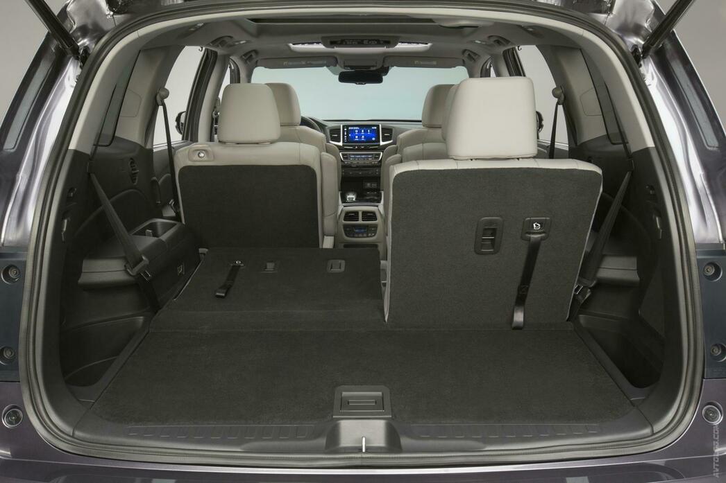 Трансформация салона в «Пилоте» продумана на «отлично». Откинуть спинку и сдвинуть вперед задний диван можно с помощью кнопки в торце подушки. Таким образом освобождается беспрепятственный проход на третий ряд, который на удивление гостеприимен даже к людям выше среднего роста. Места достаточно и в коленях, и над головой, но вряд ли здесь будет удобно троим пассажирам, если это не малорослые детишки. В любом случае средний подголовник имеется — ведь машина позиционируется как восьмиместная. Размер багажника при разложенных сидениях третьего ряда составляет всего 305 л, но если их сложить, отсек увеличится до 827 л, а, убрав спинки второго дивана, вы получите хибарку объемом 1779 л.