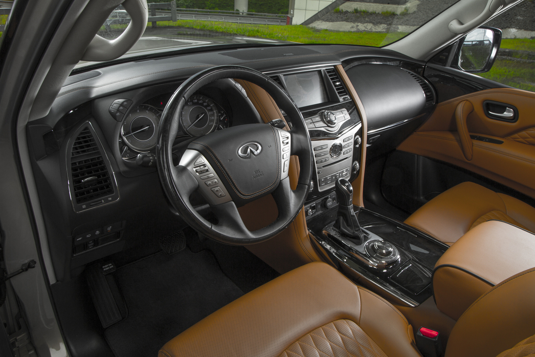 Если прежде о премиальности Infiniti QX80 говорили пластик и вставочки под дерево, то теперь тут классная кожа с уникальным грязеотталкивающим покрытием и натуральное дерево. Причем в зависимости от индивидуальных предпочтений можно выбрать между классическим оформлением салона и контрастным двухцветным.