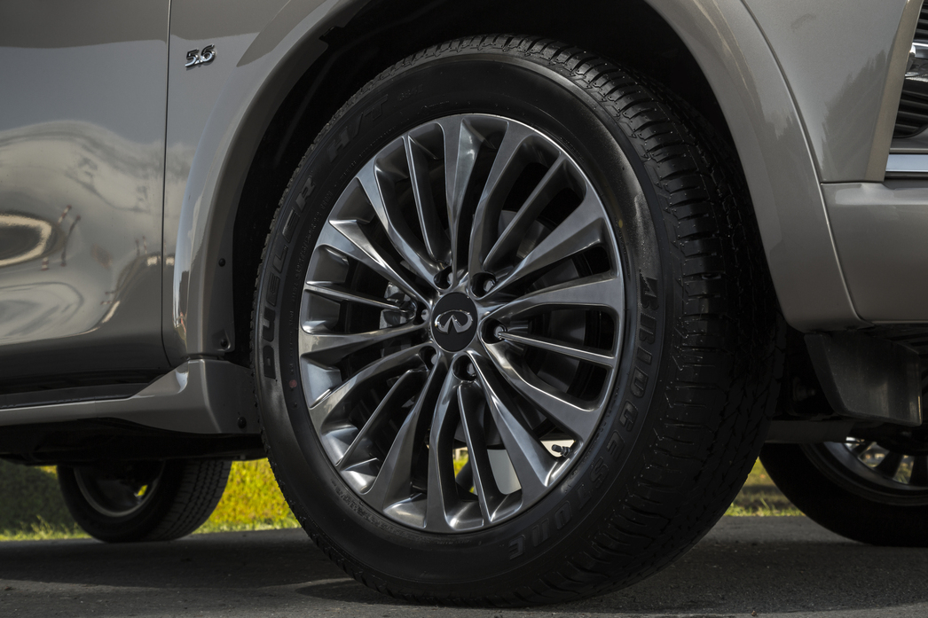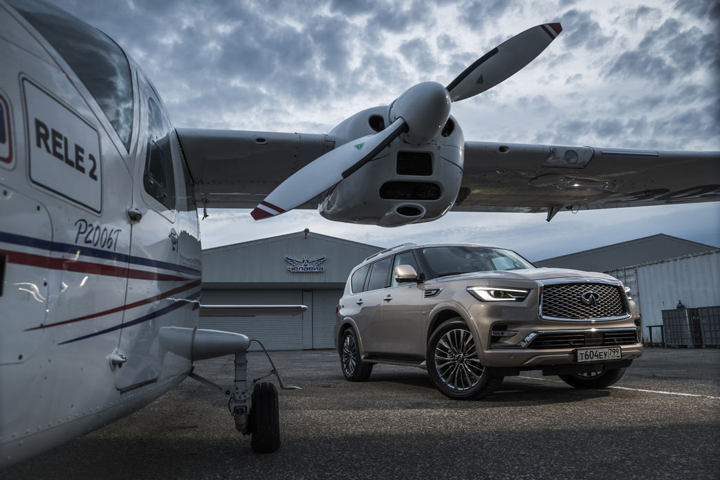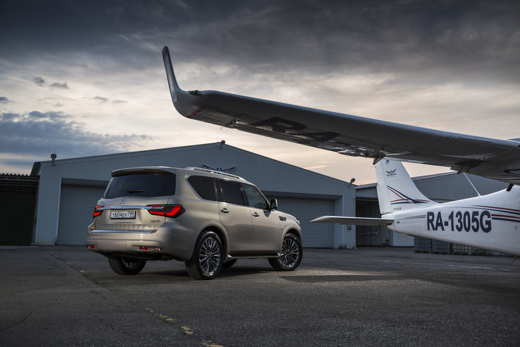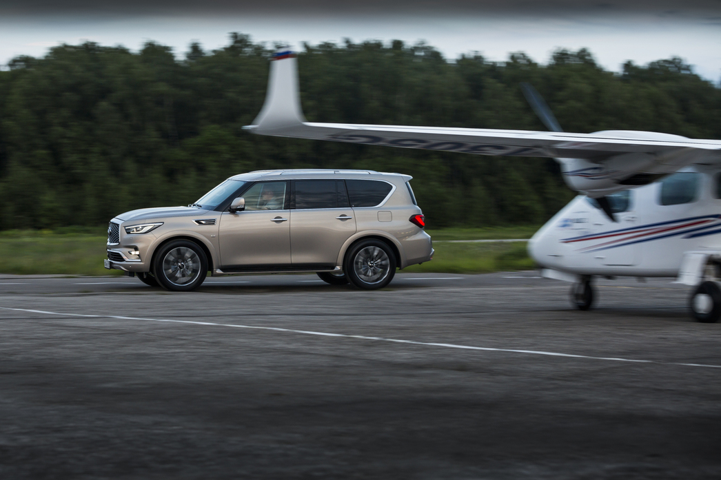 А вот над подвеской инженеры поколдовали порядочно. Изменение настроек и установка более жестких амортизаторов принципиально отразились на поведении Infiniti QX80. Внедорожник с подключаемым полным приводом в соотношении 50/50, обутый в штатные 22-дюймовые «катки», буквально вгрызается в поверхность — будь то асфальт, или бездорожье. Автомобиль прекрасно держит дорогу на прямой и уже не валится на бок в поворотах.