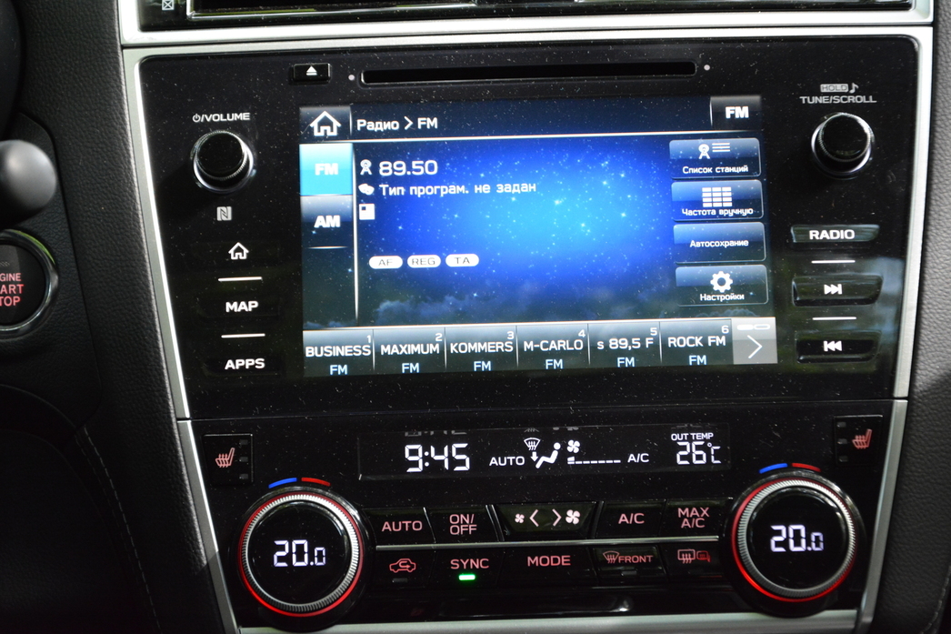 Приборная доска седана особой новизной не блещет. Тут все выглядит практически так же, как и на дорестайлинговом варианте. А вот центральная консоль стала совершенно иной. На ней появился прекрасный — большой и со вкусом оформленный — тачскрин «мультмедийки» со всеми положенными для современной машины «примочками». Блок управления климатом тоже посвежел. Например, «крутилки» настроек температуры обзавелись собственной индикацией этой самой температуры. В этом смысле у Legacy все стало «как в лучших домах», за что японцам, как говорится, — безусловный «лайк»!