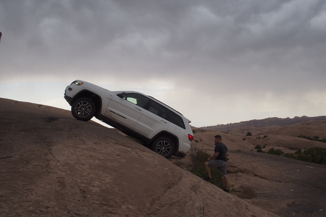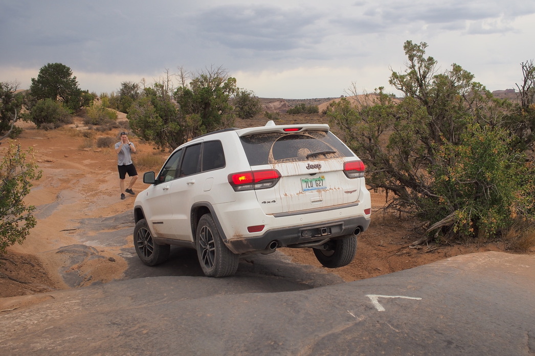 Понятно, что по сравнению с прямым наследником легендарного Willys и база у него куда длиннее, и свесы (хотя надо заметить, что в целом геометрическая проходимость Trailhawk впечатляет: углы въезда/съезда — 36,1/26,1 градуса, угол рампы — 26,7). Да и при полностью задействованной пневматической подвеске Quadra Lift центр тяжести для покорения крутых горок смещается совсем не туда, куда хотелось бы (а как без нее, если приходится пропускать between the legs обломки скал размером с голову теленка?). И еще, конечно, не надо забывать про несущий кузов и заточенную в первую очередь под комфорт подвеску.