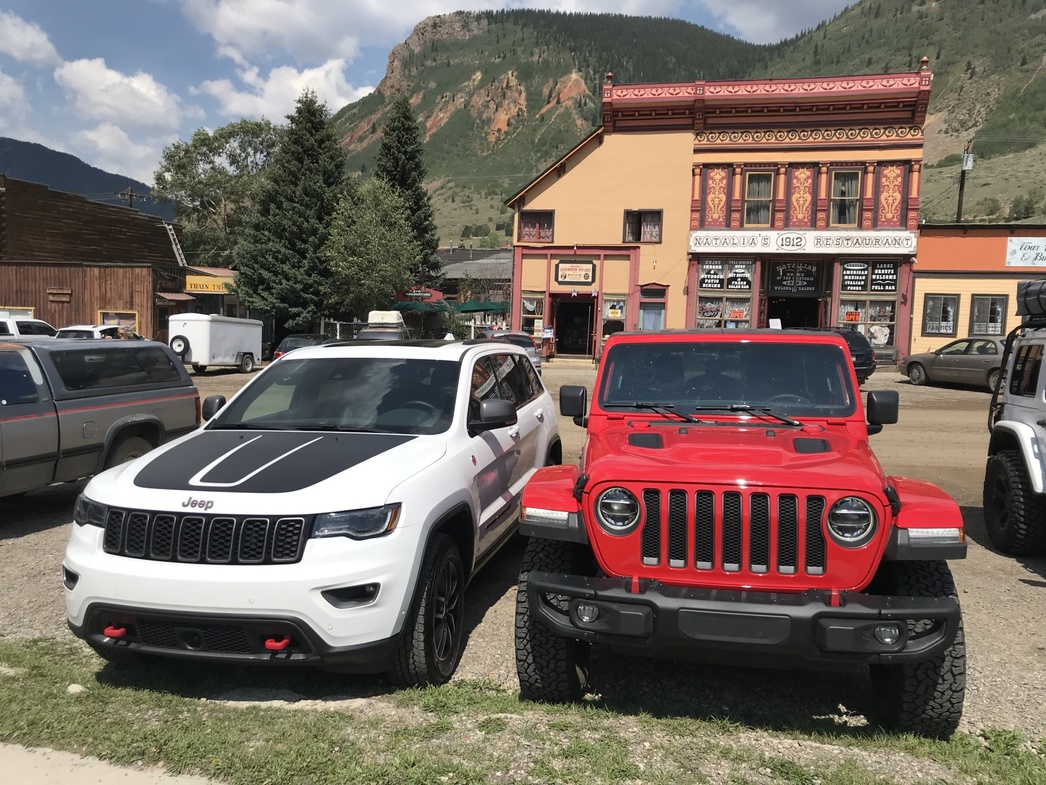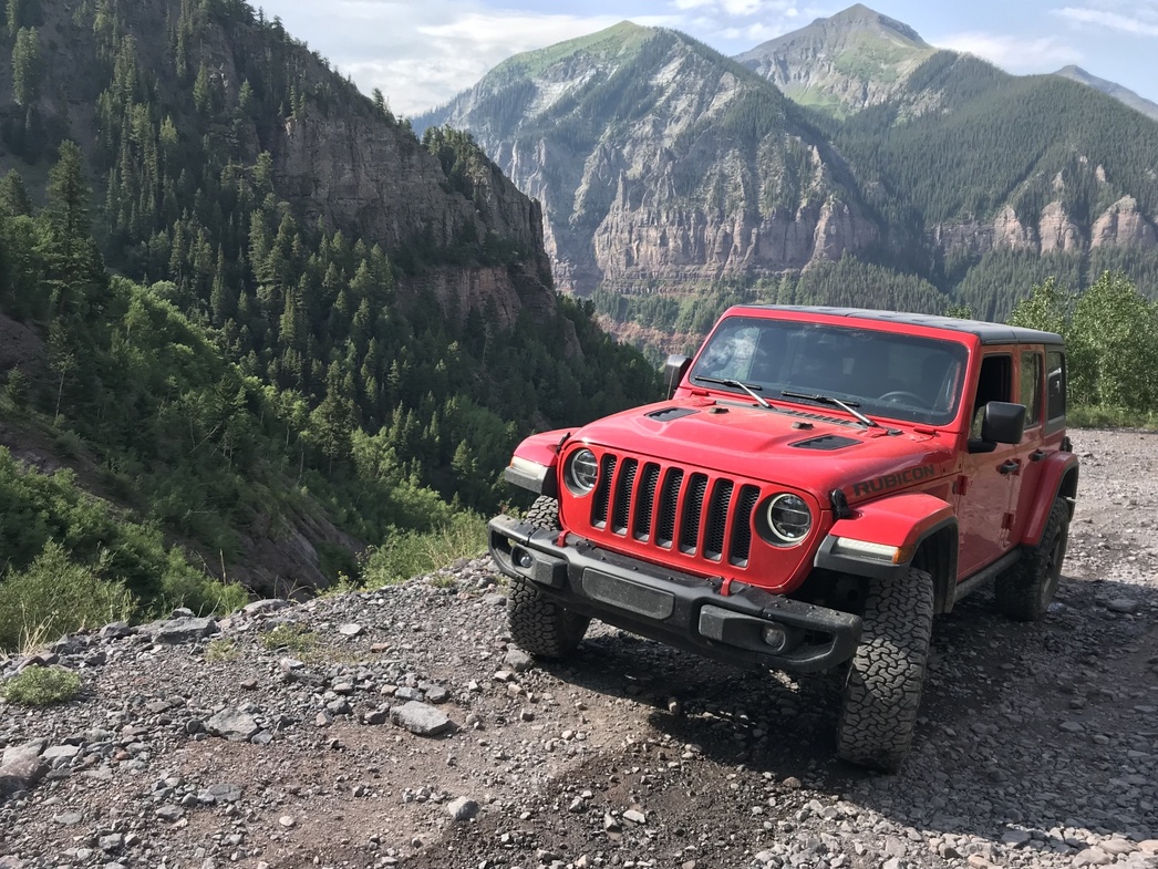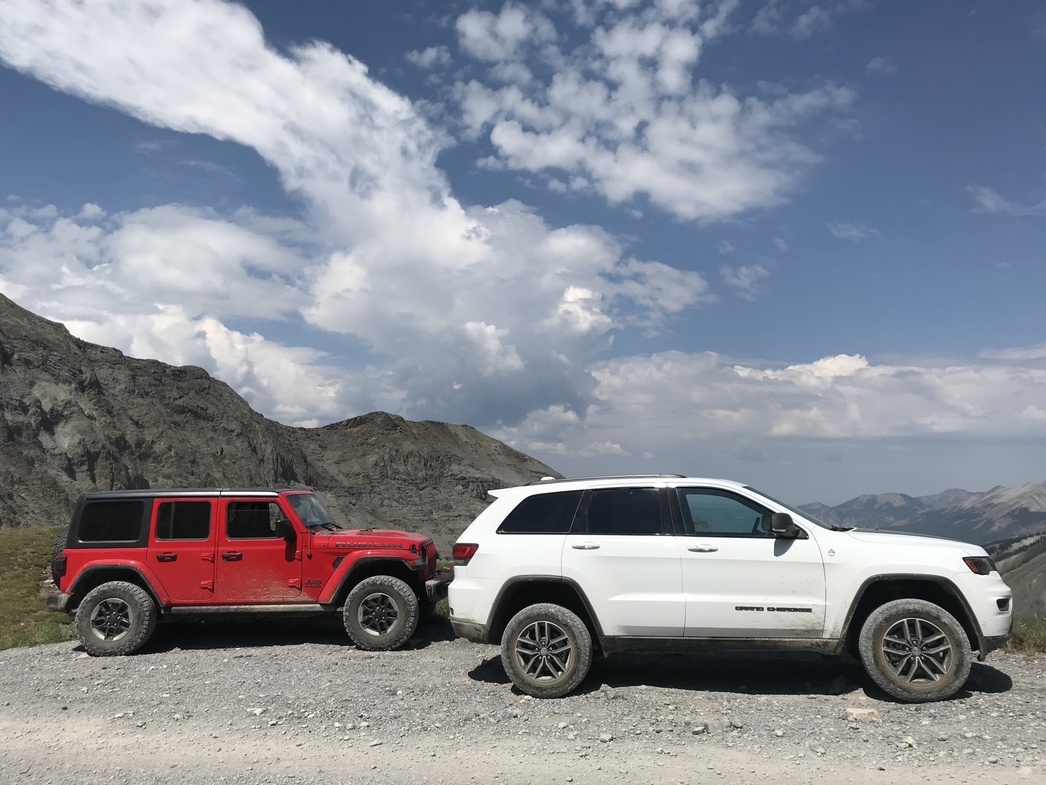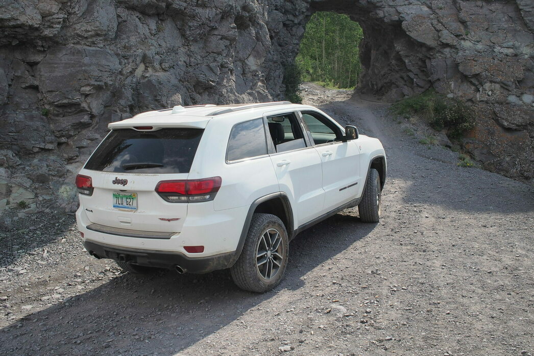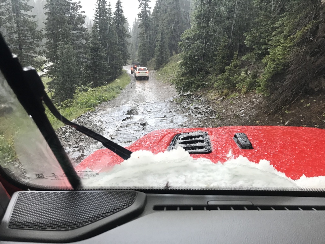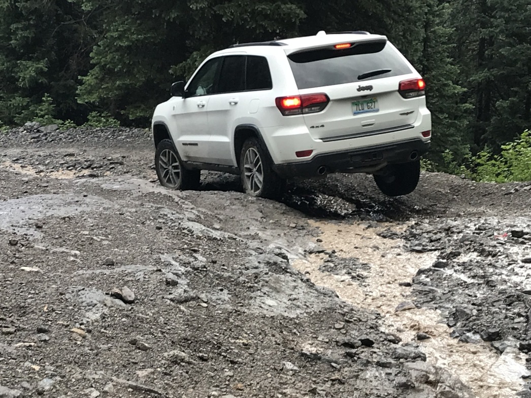 Но врубаешь 4WD Low, режим «Скалы», поднимаешься над землей на 274 мм — и он справляется с проблемами не хуже Rubicon. Нет, хуже, конечно, заставляя водителя поднапрячься, но вполне уверенно. Пусть и с водительским напряжением, но Jeep Grand Cherokee Trailhawk реально способен справиться практически с любым бездорожьем. Что, впрочем, подтвердило и жуткое ненастье, заставшее нас на спуске с одного из пиков Скалистых гор. Внезапный град с дождем и снегом в секунды превратил тропу (глина и камень) в каток, направление за пеленой ненастья едва угадывалось.