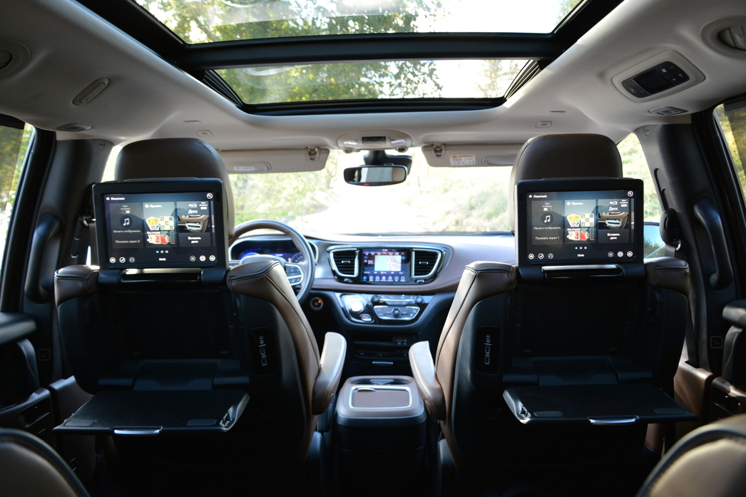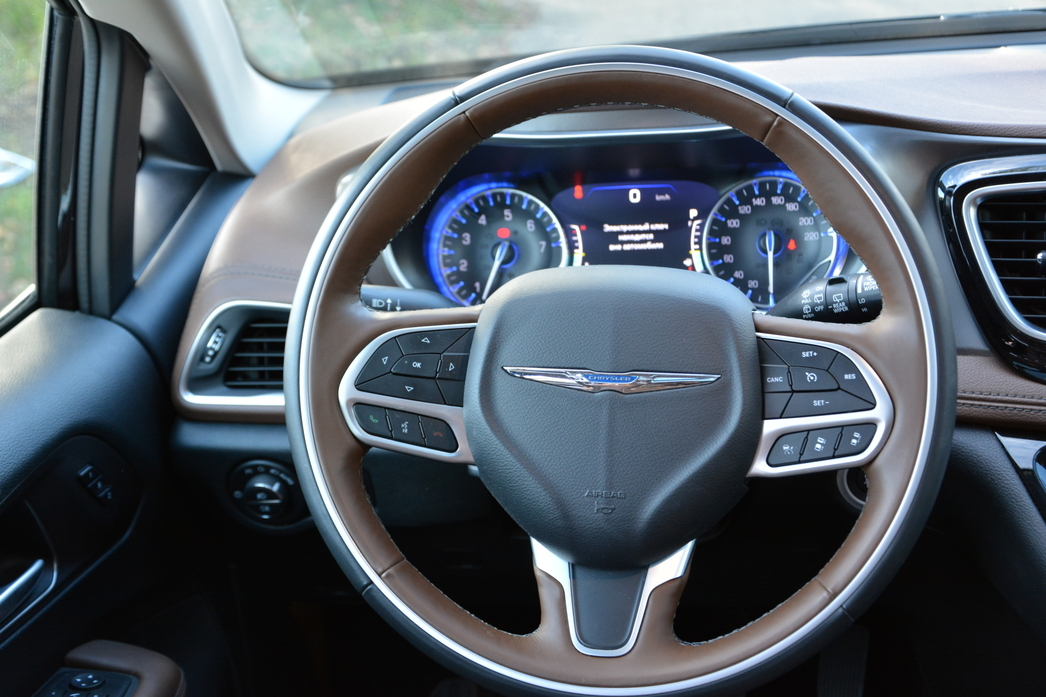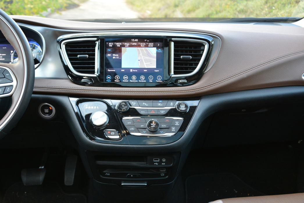 Кстати говоря, оформление приборной панели, стиль «картинок» на тачскрине монитора мультимедиа в центральной консоли, характер проработки «вращалок-нажималок» системы климат-контроля и прочего — все тут выглядит вполне по-европейски, без малейшего намека на «староамериканскую» простоватость и пренебрежение к деталям дизайна. Все очень культурно, функционально и богато. Почти как в каком-нибудь авто из премиум-сегмента. Да и цена, надо сказать, у Pacifica вполне премиальная — 4 млн. рублей!