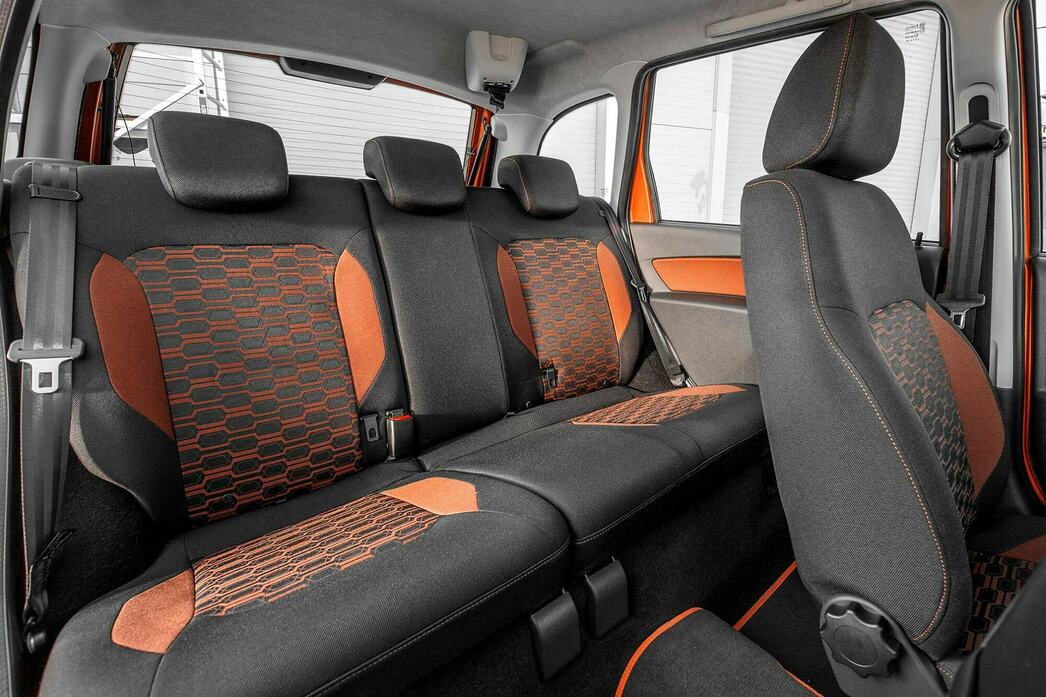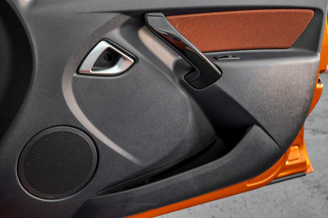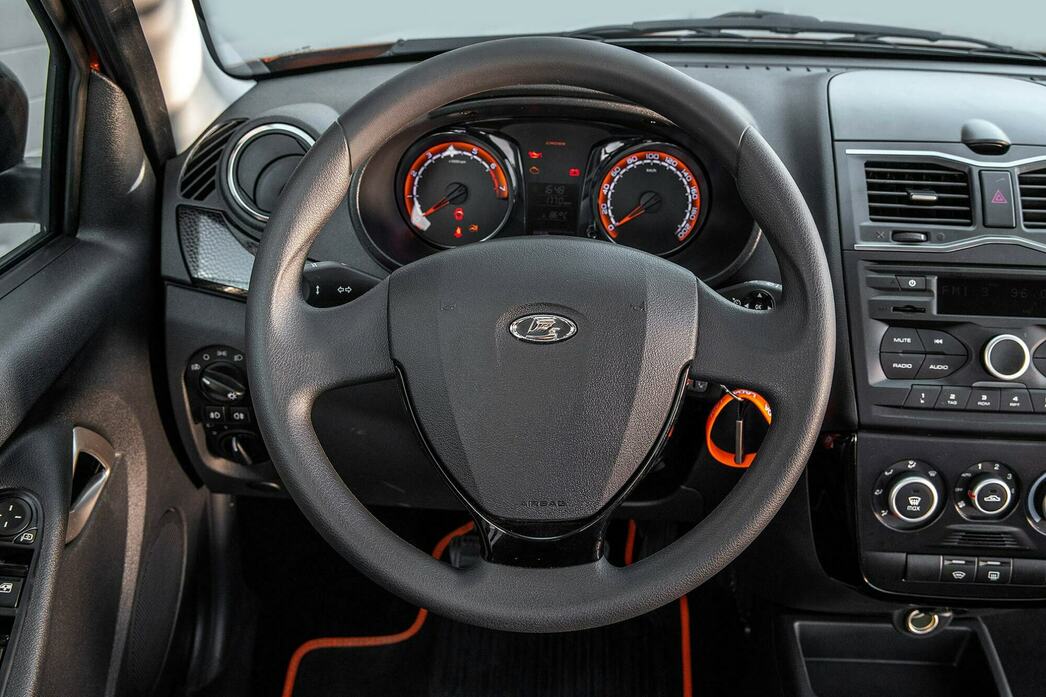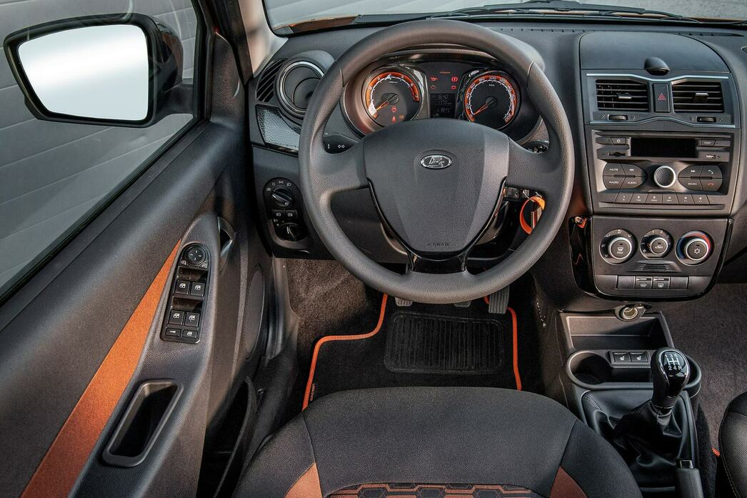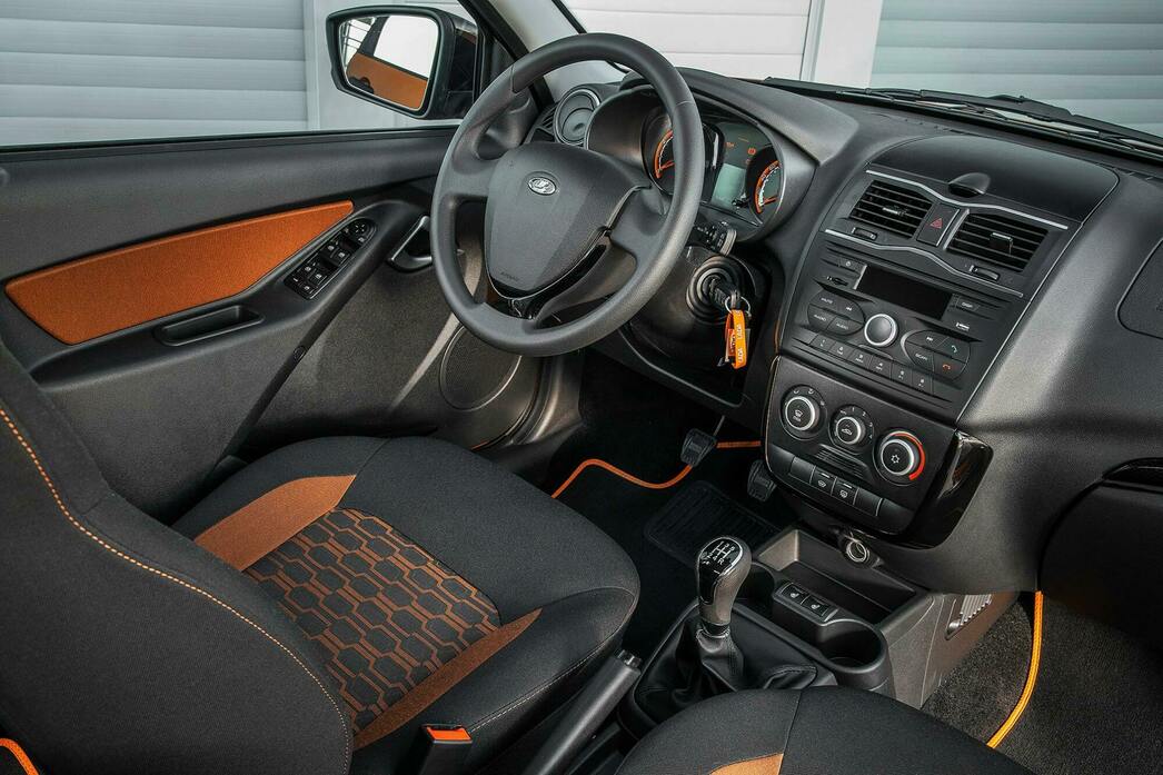 Если у вас нет изжоги от апельсинового сока, то наверняка оцените оранжевые нотки в оформлении интерьера. Выглядит сочно, но понравится не всем. Помимо табличек, указывающих на принадлежность Granta к отдельной касте, салон козыряет новым блоком климатической установки и боксом для вещичек поверх торпедо под стать «маршруткам» системы «Газель».
