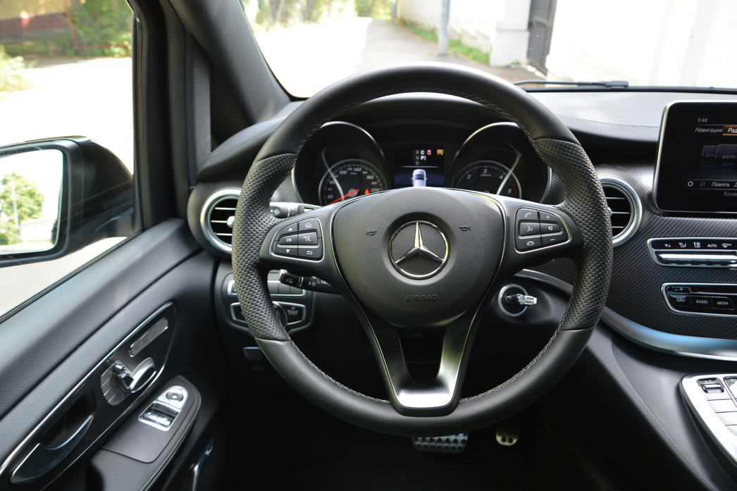Он тут не водитель «маршрутки», дело которого доставить «верхушку» компании в аэропорт. Драйвер V-klasse не будет завидовать гражданину, пилотирующему, например, Mercedes GLS! У него точно также есть все, что ожидаешь от большого Mercedes: комфорт посадки (только еще выше и лучше видно дорогу), фирменные мерседесовские «фишки», типа «планшетника» мультимедийной системы, управляемого джойстиком и сенсорной панелью, системы кругового обзора, распознавания знаков и слежения за разметкой, небольшой и хваткий руль, обернутый кожей…
