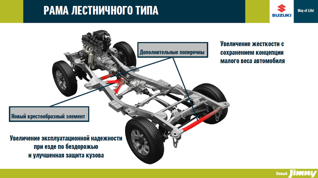 Слава всем Богам — принципиально конструкция Jimny не изменилась. У него, как прежде, рама лестничного типа, которая потяжелела на 10 кг. При этом, жесткость на кручение конструкции выросла на 15%. Никуда не делись и прочие атрибуты честного внедорожника: неразрезные мосты, пружинная подвеска, жестко подключаемый передний мост и «понижайка» в раздаточной коробке.