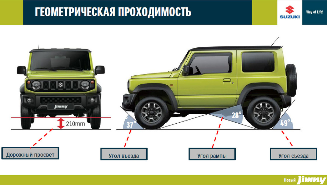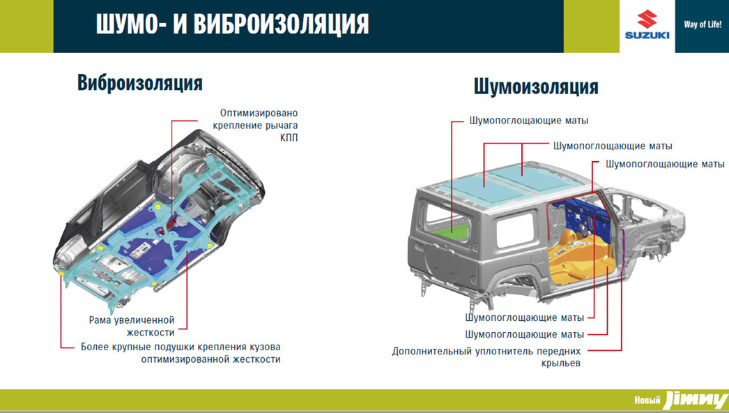 При прежней колесной базе (2250 мм) машина стала крупнее. Ширина выросла на 45 мм (до 1645 мм), а высота на 5 мм (до 1720 мм). А вот в длину «Джимник» теперь короче на 45 мм (3645 мм).