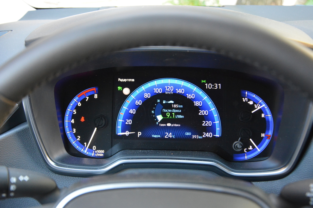 Кстати, о круиз-контроле. Он тут адаптивный, с помощью радара на «морде» машина умеет отслеживать и держать расстояние до впереди идущего транспорта. В целом, очень удобная штука. Но с одной особенностью. Когда перед тобой тормозит другое авто, «круиз» Corolla честно оттормаживает ее только до скорости 20 км/ч. А потом отключается, позволяя авто катиться дальше к препятствию.