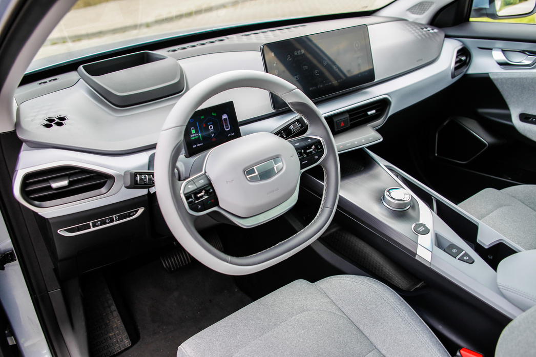 Так что ездовым повадкам «Геометрии» — однозначный «лайк». И салону — тоже: дизайн, материалы, эргономика очень хороши… Но не безупречны. Как только начинаешь приглядываться, то тут, то там вылезают мелкие огрехи. Скажем, сенсорные клавиши на центральной консоли становятся абсолютно невидимыми при ярком солнце. А крошечному экранчику панели приборов, в отличие от огромного центрального тачскрина, недостает солидности.