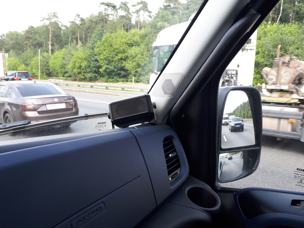 Выезжаю на дорогу и отмечаю, что обзорность у авто отличная. Боковые стойки остались узкими, а в крупные зеркала видно практически все. Раздражает лишь огромная грубая колонка, прилаженная к правой части передней панели. Это извещатель системы ЭРА-ГЛОНАСС. Пожалуй, для него могли найти другое место.