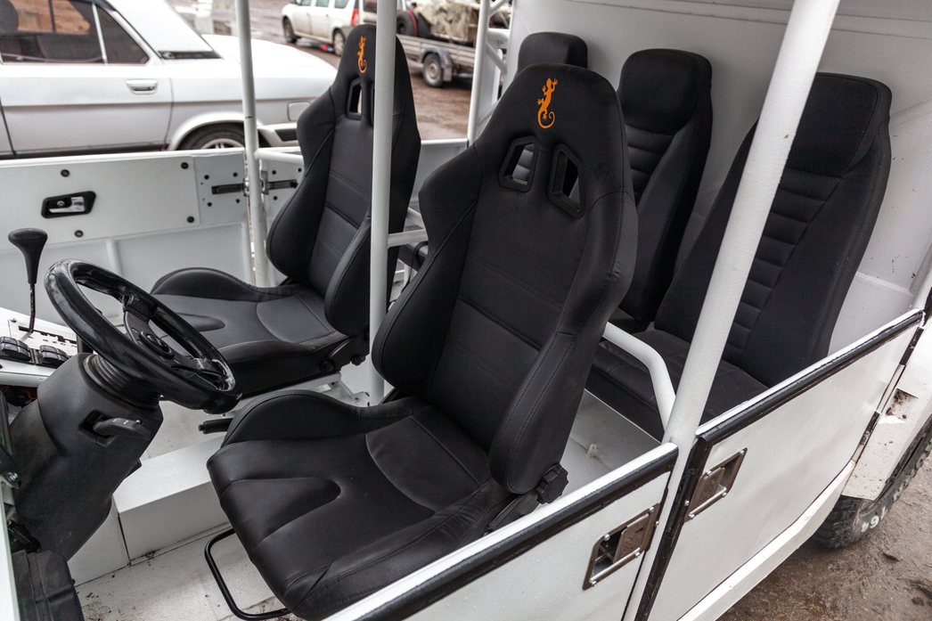 Передние кресла имеют продольную регулировку и регулируются по углу наклона спинки. Также есть небольшой ход и у рулевой колонки. И говоря о пассажирах, вновь невозможно не вспомнить о безопасности. Конструкция шахтенной техники обязательно должна соответствовать международным требованиям FOPS (защита от падающих предметов) и ROPS (защита от опрокидывания). Собственно, чтобы выполнить их «Стахановец» получил каркас из бесшовных 40-миллимитровых труб, которые обеспечили необходимую жесткость не только кузову, но и крыше.