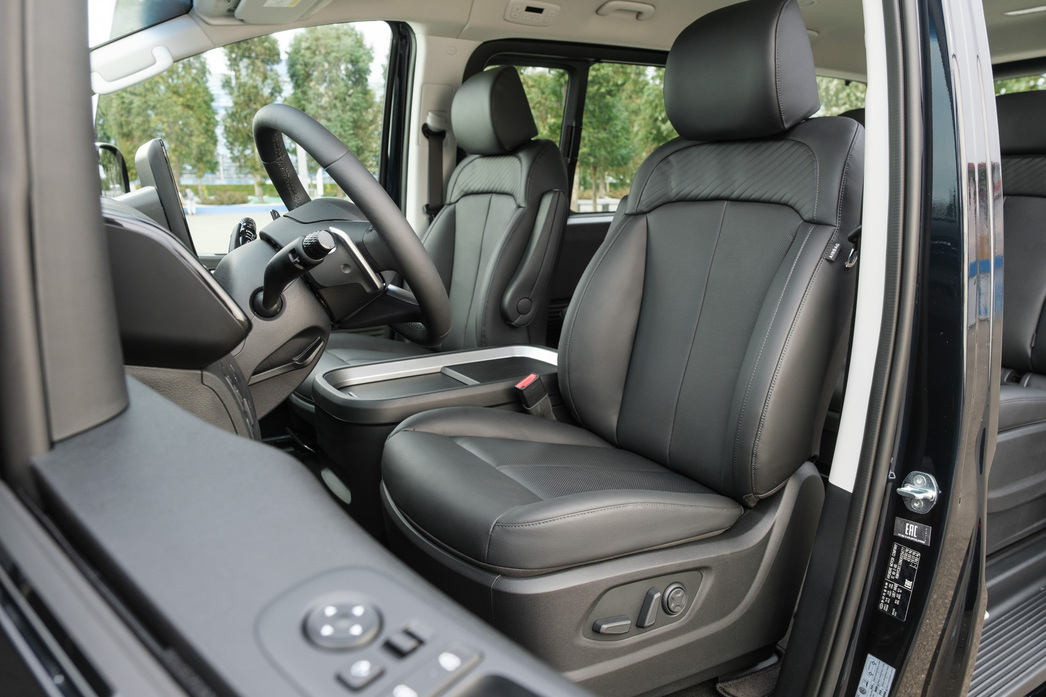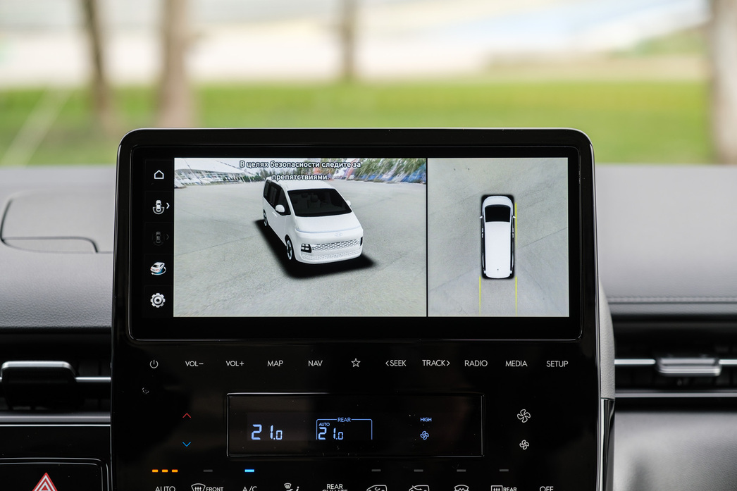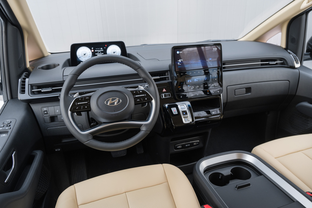 Теперь черед сесть за руль и оценить удобство для водителя. Внутри Hyundai Staria правит минимализм. Графическая приборка диагональю 10,25 дюймов словно вырастает из передней панели. Вокруг много подстаканников, ниш и ящичков. Все как в обычном минивэне.