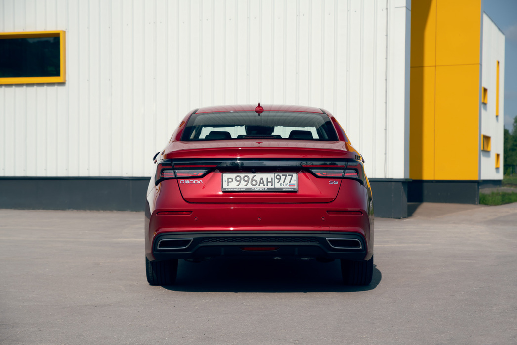 После знакомства с первопроходцем Omoda в лице кроссовера С5, который привлекает неординарным футуристичным дизайном и космическим салоном, седан S5 не кажется чем-то выдающимся. Фасад украшен россыпью «бриллиантов», аккуратно разложенных на «гриле», а корма вызывает ностальгию по Toyota Corolla.