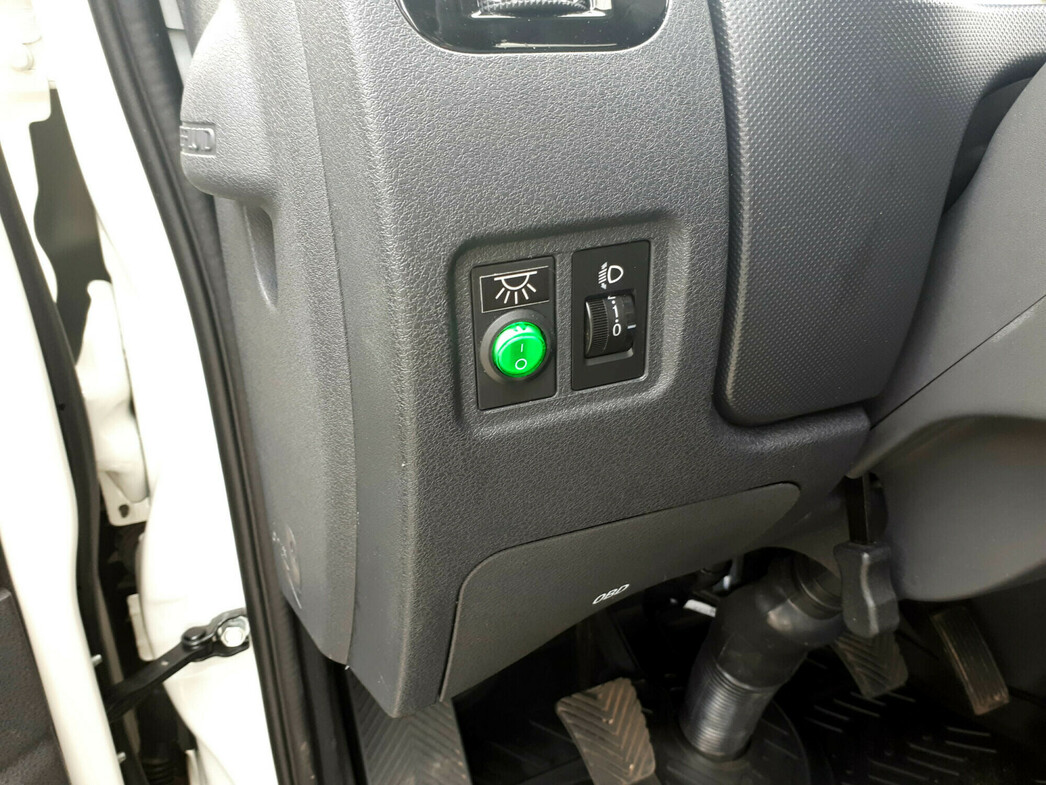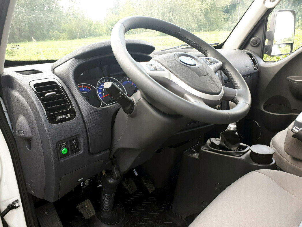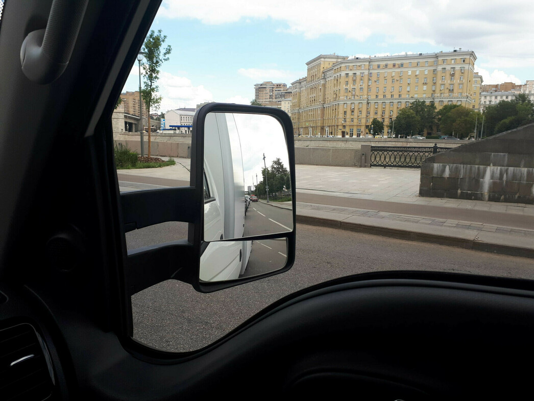 Открываю водительскую дверь и оказываюсь в кабине. Сразу отмечаю, что у машины отличная обзорность. Так и хочется сказать, что «сидишь, как в аквариуме». Что с точки зрения комтранса — серьезный плюс. Видно абсолютно все и это помогает в узких городских переулках-проездах. Только зачем тут салонное зеркало? Оно абсолютно бесполезно.