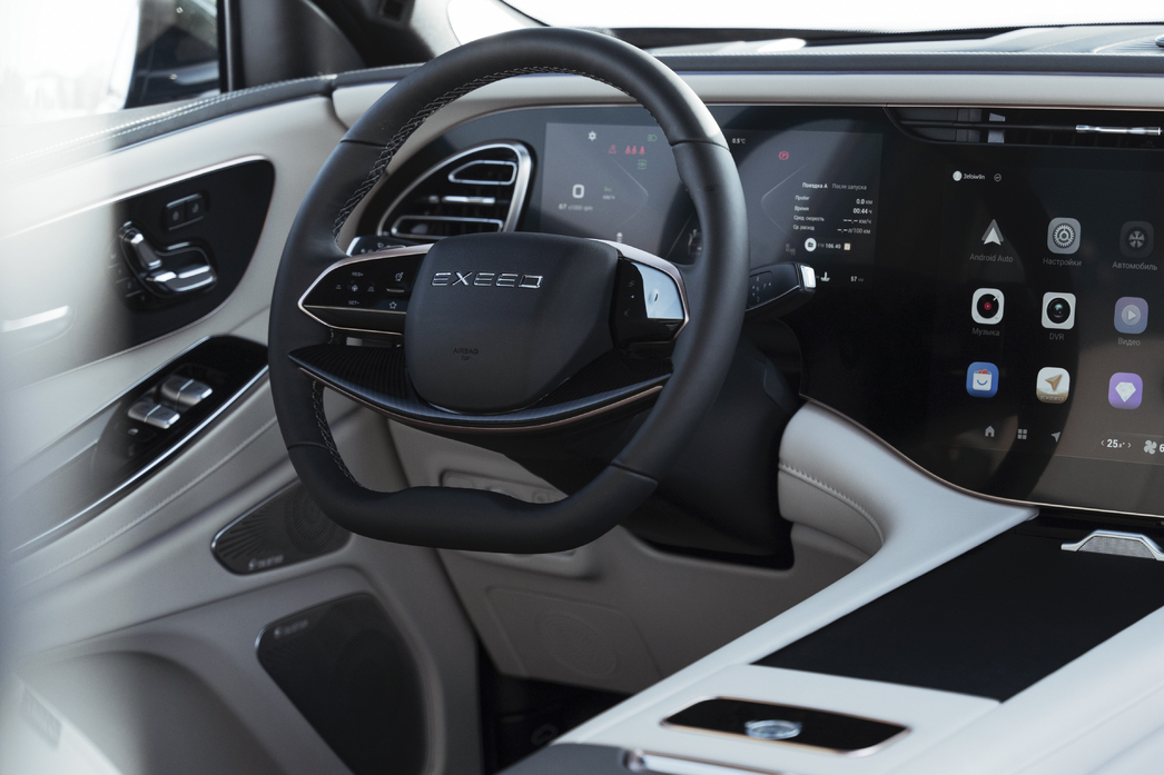 Если дорестайлинговый Exeed VX «рисовал» небезызвестный дизайнер Кевин Райс, успевший отметиться и в Mazda, и в BMW, то команду, работавшую над обновленной версией кроссовера, возглавил Кристофер Роудс, в чьем резюме значатся Honda, General Motors и Mercedes-Benz. Так что, полагаю, вопрос «Почему интерьер актуального VX так сильно перекликается с внутренним убранством Mercedes-Benz EQS?» сразу можно закрыть. А ведь действительно — здесь нас тоже приветствует гигантская стеклянная панель, заслоняющая три отдельных дисплея. Красиво? Красиво. Удобно? Не очень.