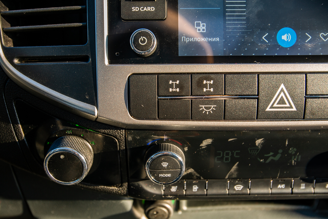 Внутреннее убранство стало гостеприимнее: полочки, ящички, подстаканники, подставка для телефона, подрессоренное водительское кресло. Впрочем, салон для всей линейки NN универсален, так что повторяться бессмысленно. Гораздо важнее для нас сейчас электронная шайба, которая отличает новый «Соболь» от всех собратьев — подключение полного привода и «понижайки» переехало с пола и «ручки в кучку» на центральную консоль.