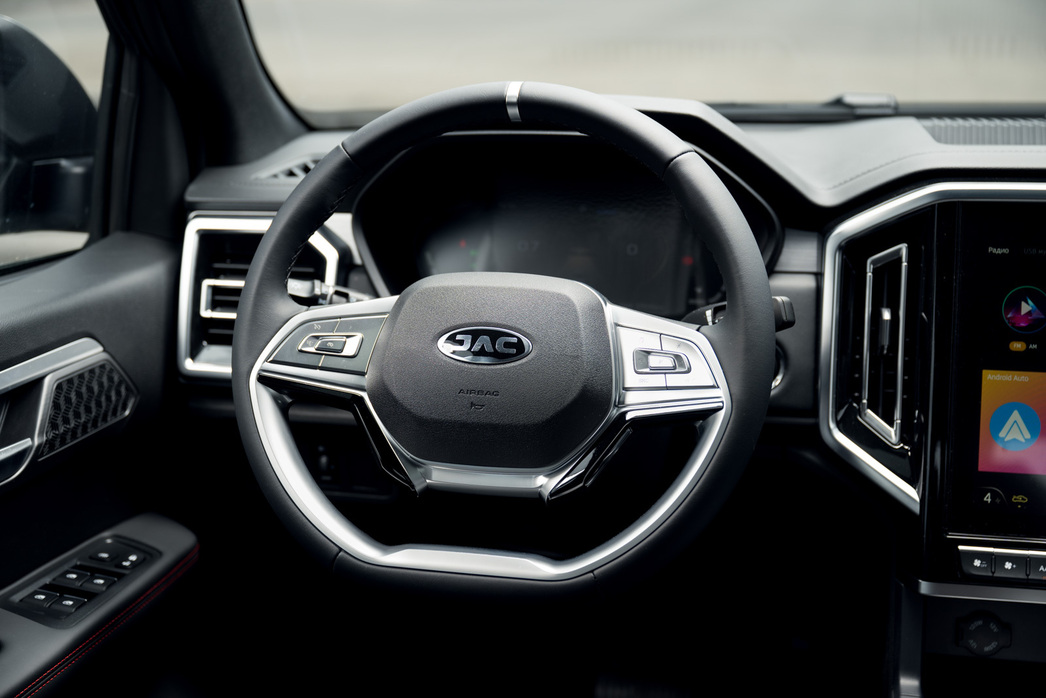 Внутри автомобиль тоже сделан по последнему писку моды. Здесь и отделка из качественного кожзама, и огромный вертикально расположенный мультимедийный дисплей, и здоровый люк, больше напоминающий панорамную крышу, и круиз-контроль (не адаптивный, правда), и беспроводная зарядка для смартфона... Еще из «плюшек» в JAC T9 имеются передние сиденья с электроприводом, 6 подушек безопасности (что, в общем-то, небывалая роскошь для пикапов, хотя на китайском рынке данная модель оснащена аж 7 подушками), климат-контроль, зеркало заднего вида с автозатемнением, камеры кругового обзора. В общем, напичкан пикап таким количеством «ништяков», что иной среднестатистический китайский кроссовер позавидовать может.