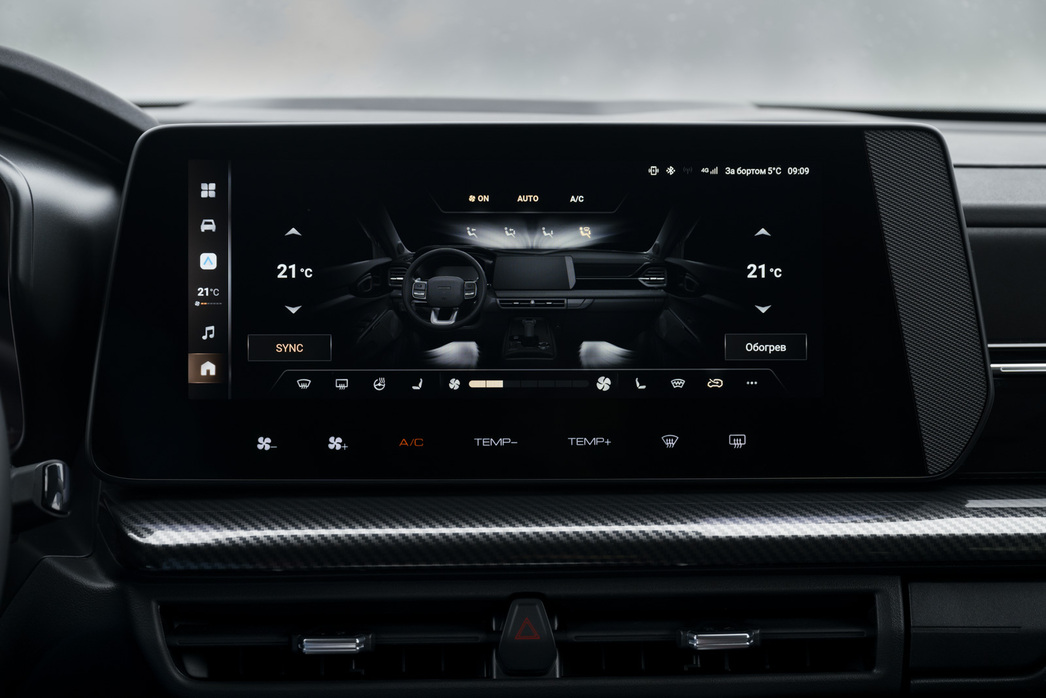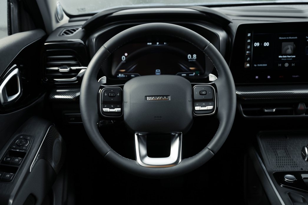 Интерьер новинки, равно как и ее экстерьер, мне, что называется, «зашел». Добротная отделка мягкой экокожей, гармоничные вставки под карбон и хром. Строго, дерзко и современно — ни малейшего намека на вычурность, от которой, впрочем, Haval давно избавился. Особое внимание обращает на себя «самолетный» селектор коробки передач, перекочевавший из Tank 300. И панорамная крыша площадью 1,1 м² — самая крупная в классе, между прочим.