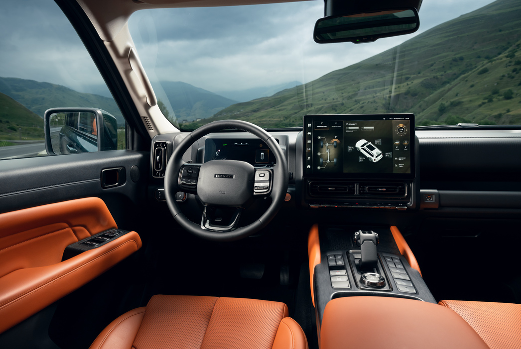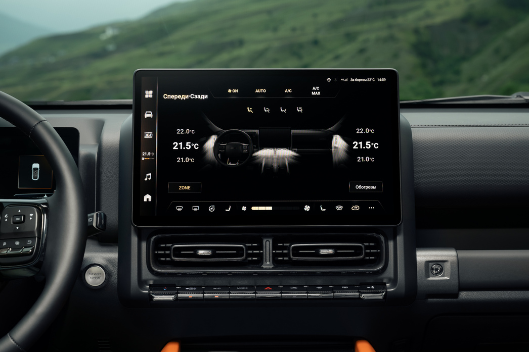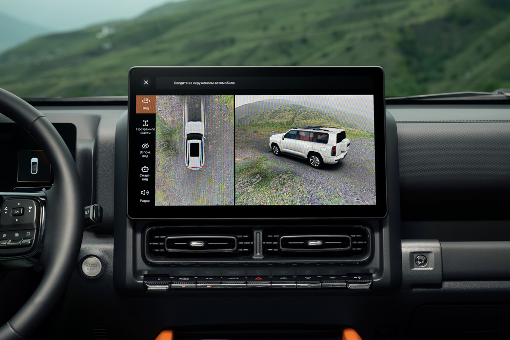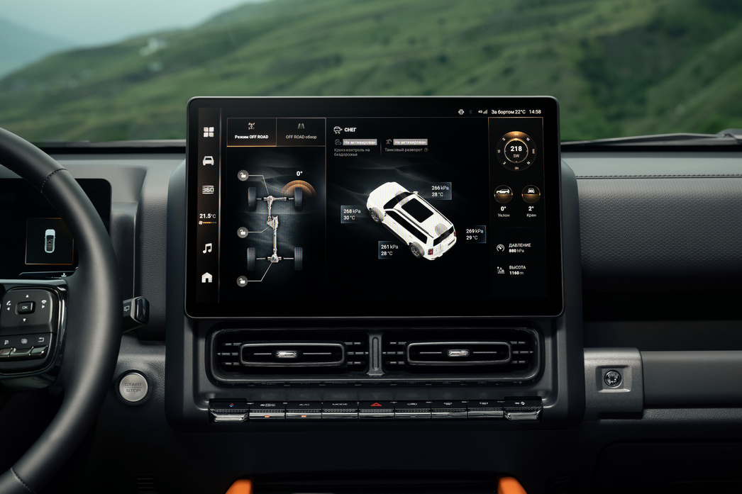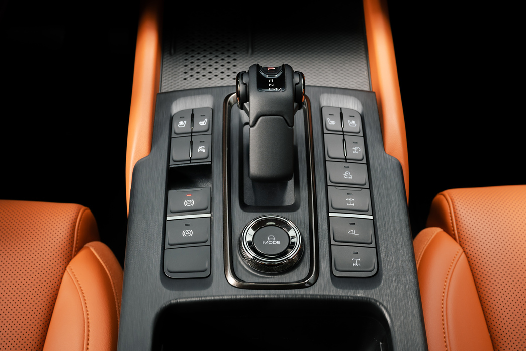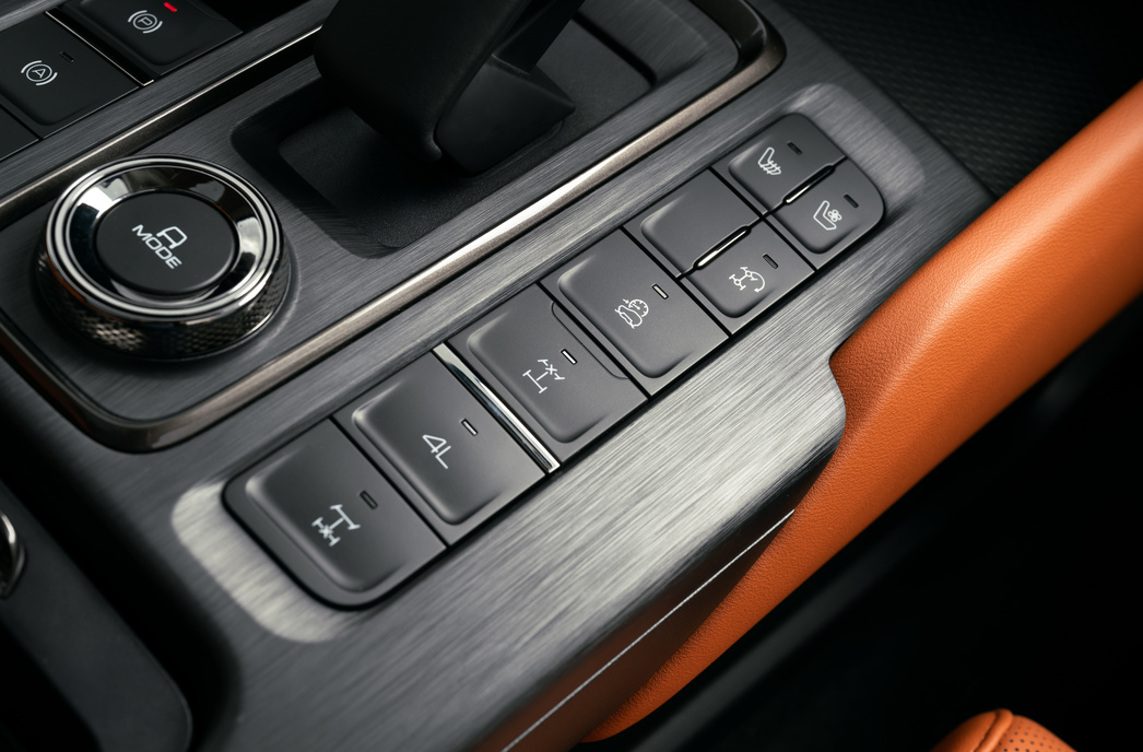 Вместе с визуализацией межосевой и межколесных блокировок эти приборы можно вызвать в меню на центральном 16,4-дюймовом мультимедийном дисплее. Тогда как на центральной консоли раскинулась богатая, прям — золотая, россыпь внедорожных кнопок: шайба выбора режимов движения, подключение понижайки 4L, межколесные блокировки, внедорожный «круиз» и даже кнопка подключения функции так называемого танкового разворота.