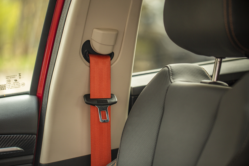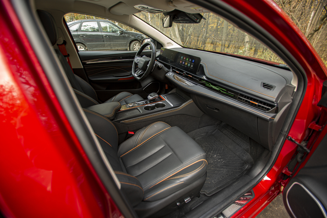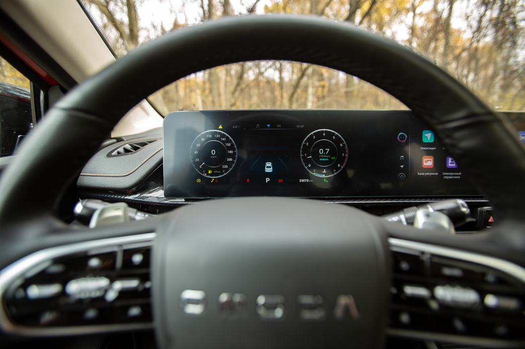 В салоне тоже полно отличий: большущий «слитный» экран, в котором и приборы, и мультимедийка, иной селектор трансмиссии и яркие вставки в обшивку. Одни красные ремни безопасности чего стоят! Передние кресла, включая водительское, в целом критику выдерживают, настроек много — удобно устроиться, пусть и не быстро, можно.