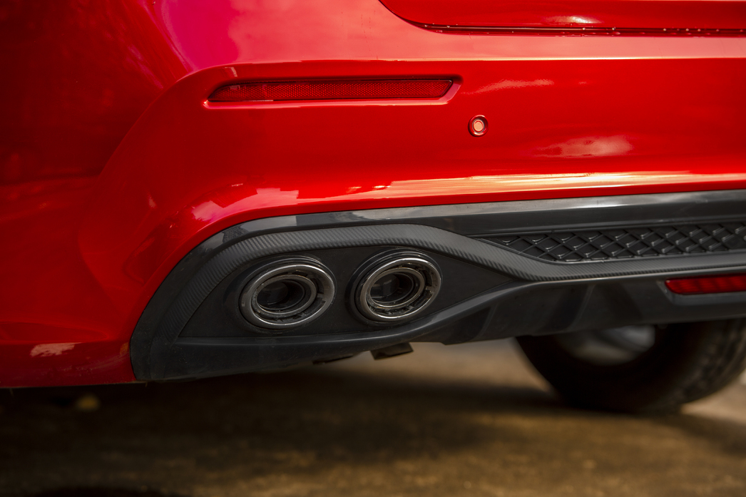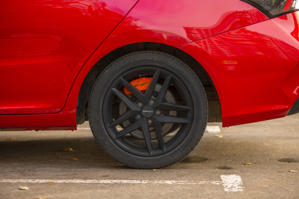 Отдельный элемент «спорта» в дизайне — колеса, вернее, черные 17-дюймовые диски, под которыми призывно краснеют совсем не крошечные тормозные механизмы. Передний — точно больше «штатного», двухпоршневой, с большей площадью колодки и, соответственно, тормозного диска. Много мощи, видимо?