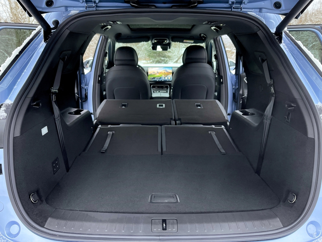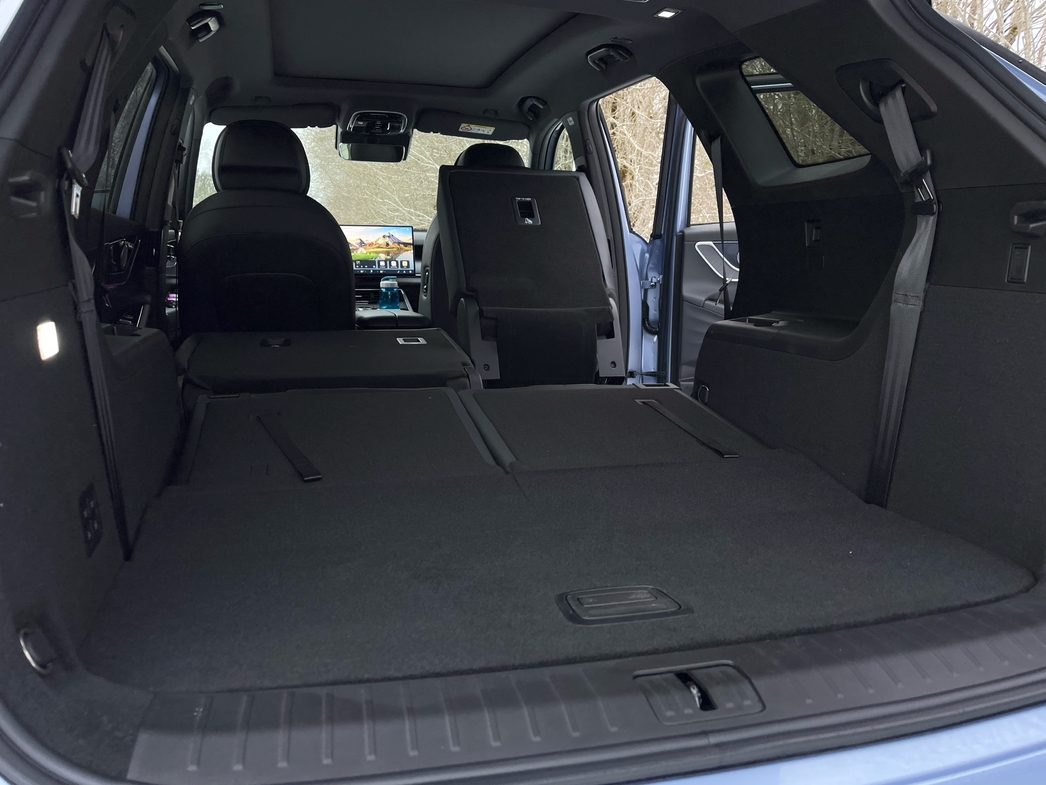 Что касается багажника, то в семиместной конфигурации его объём составляет всего 200 литров. Поместить водительский набор или бутылку с омывающей жидкостью некуда. При сложенных спинках третьего ряда грузовой отсек вместительный и глубокий. А если опустить и следующие, то есть второго (это можно сделать электроприводом прямо из багажника), то получается практически ровный пол.