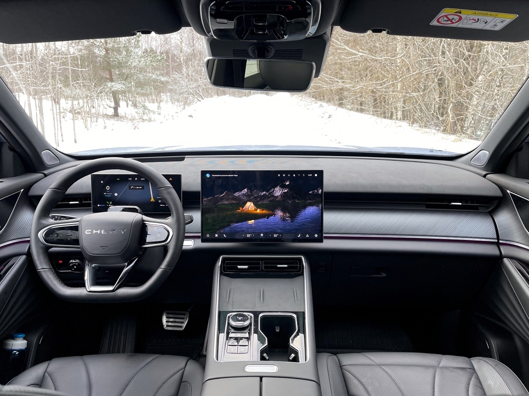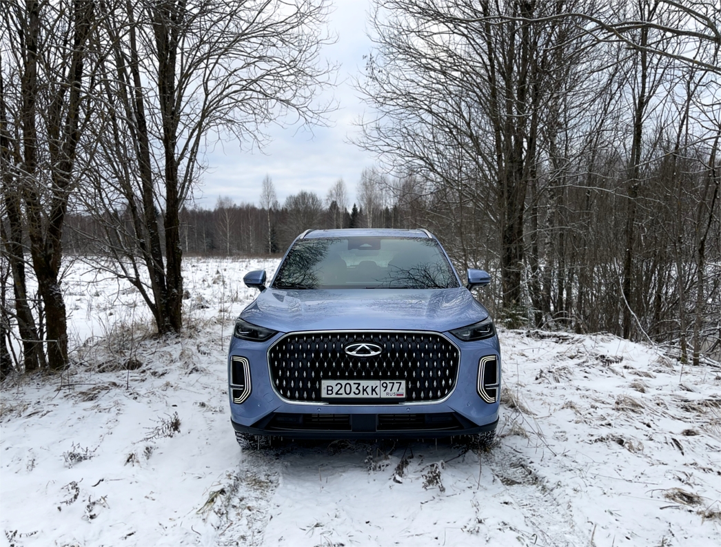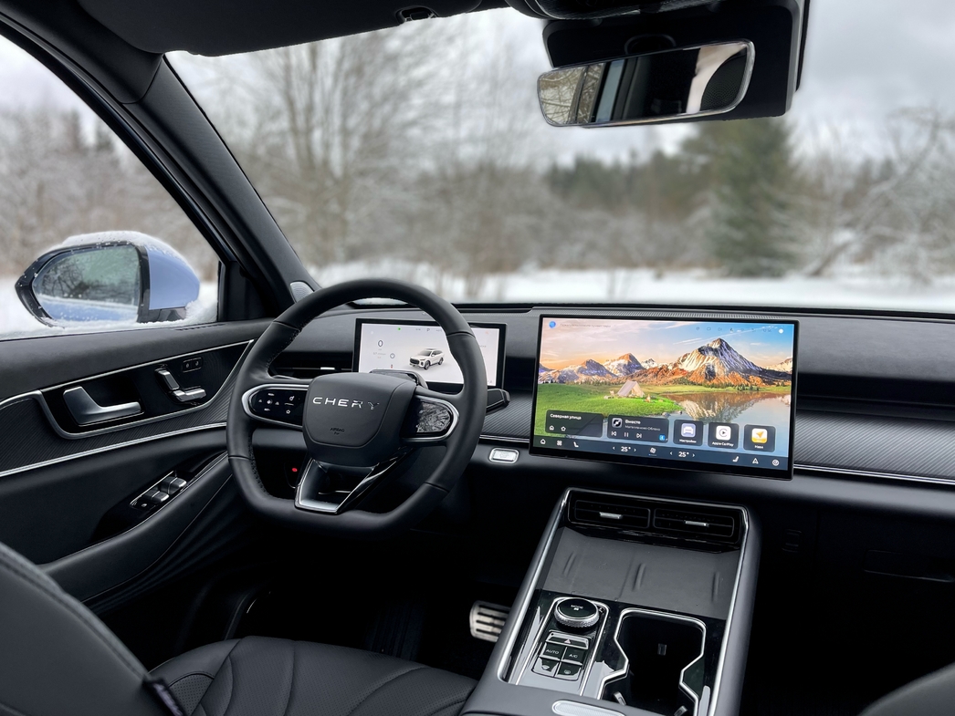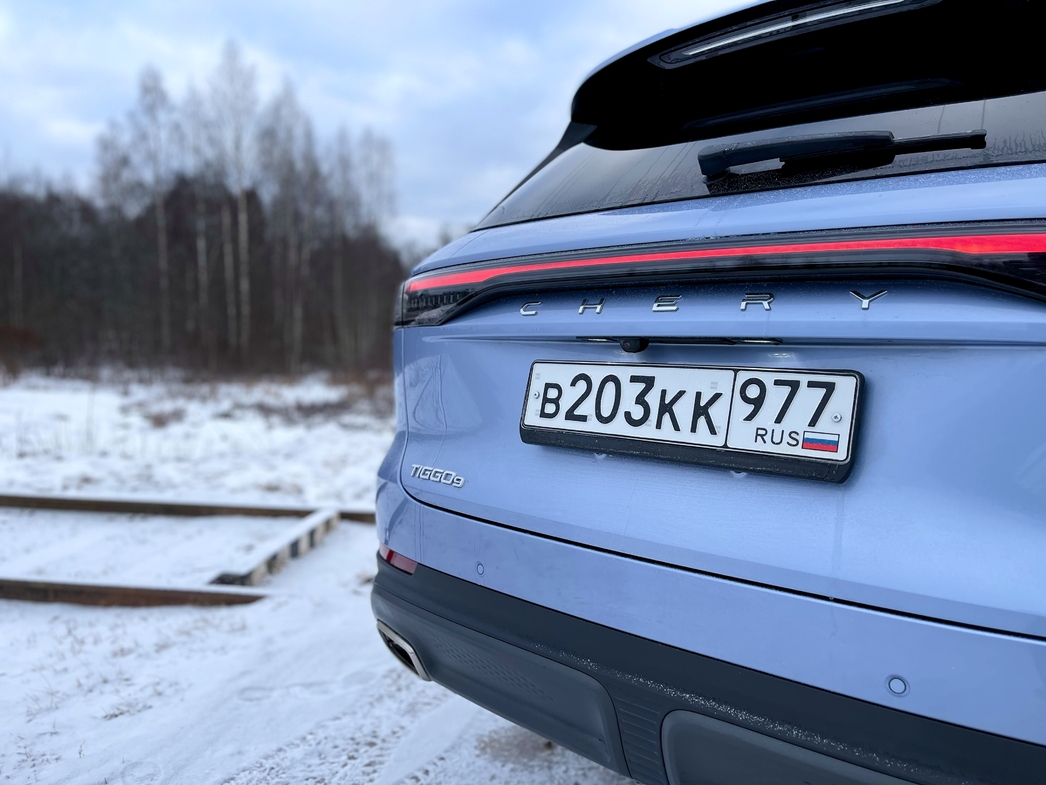 Также стоит отметить выдвижные ручки дверей — их электропривод был усилен специально для России, чтобы они лучше сопротивлялись обледенению. Колёсные диски диаметром 20 дюймов с необычным рисунком — это, пожалуй, самый яркий элемент дизайна. Tiggo 9 выглядит так, что, если и привлекает внимание, то не потому, что пытается, а потому что он просто хорошо сбалансирован.