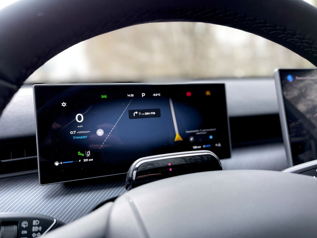 Управление коробкой передач на рулевой колонке оказалось удобным. К левому рычагу привыкаешь быстро, и оно не вызывает неудобств. На месте традиционного селектора на центральном тоннеле расположены два слота для телефонов, одно из которых оснащено мощной беспроводной зарядкой с функцией охлаждения. Это решение явно сделано с учётом потребностей водителя, который всегда может быстро «подпитать» устройство, не переживая за его перегрев.