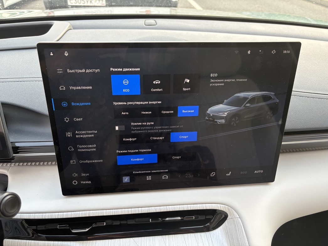 Впрочем, дело тут не только в причудливости его формы с разномастными скосами. В режимах «Комфорт» и «Эко» он настолько легкий и пустой, что кажется, будто управляешь симулятором начала 2000-ых. Переключаюсь в «Спорт» — «баранка» становится тяжелее, но ни разу не информативнее.