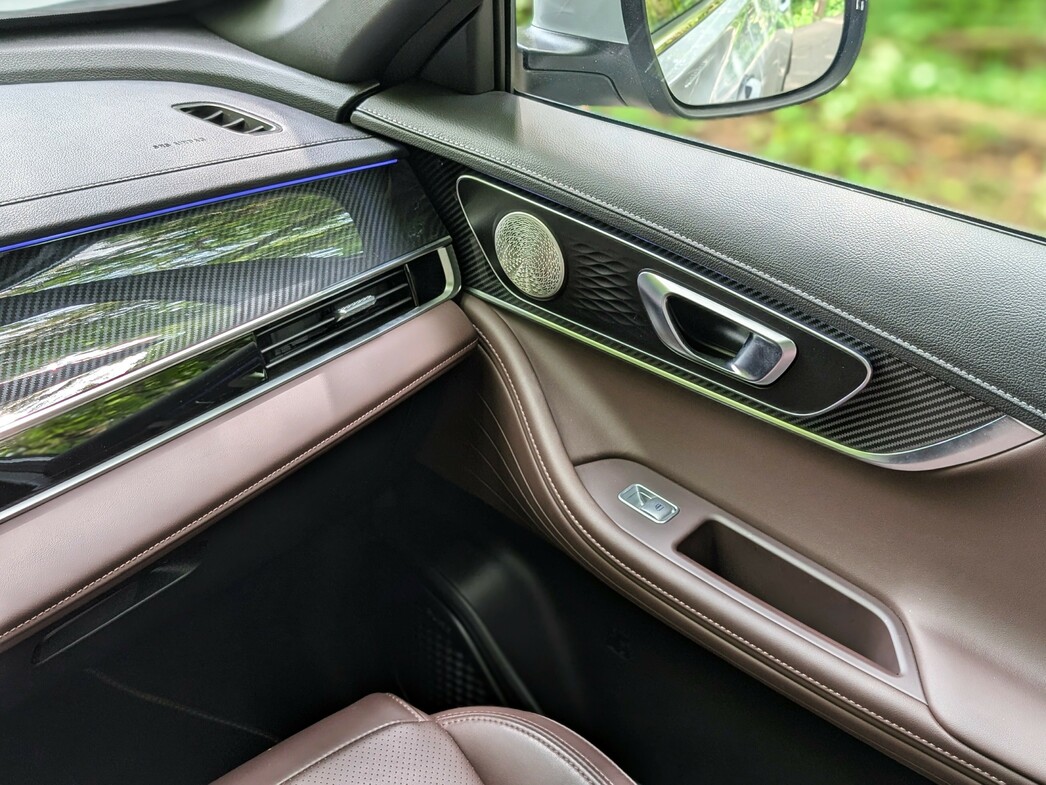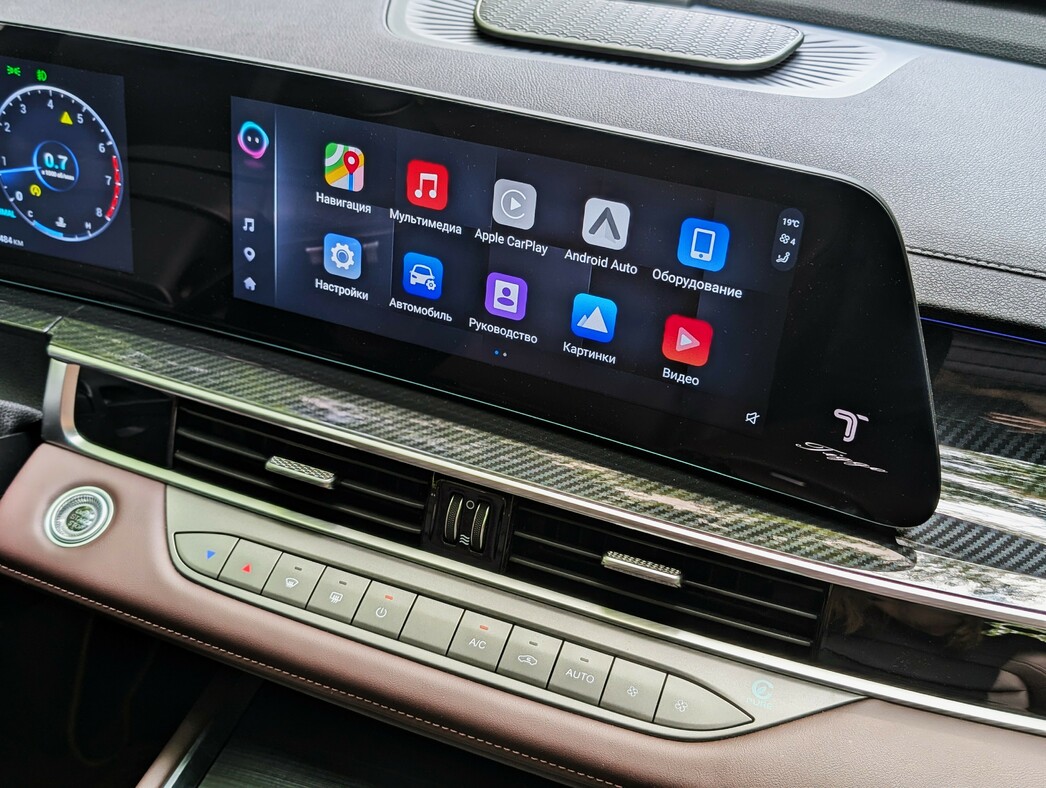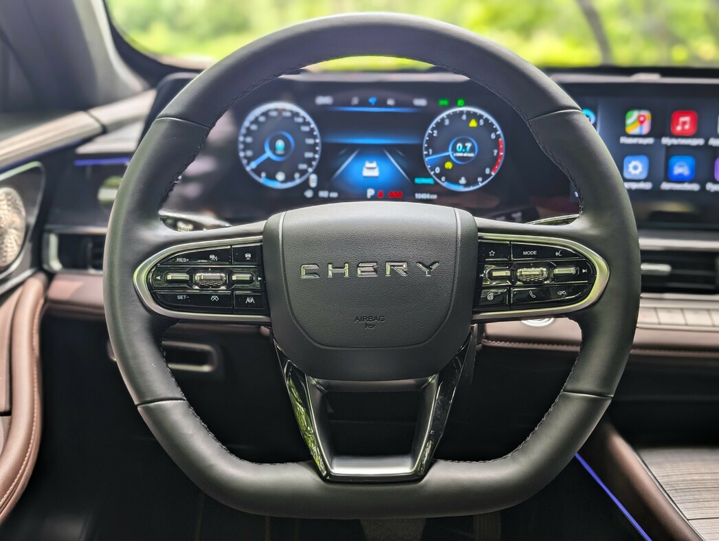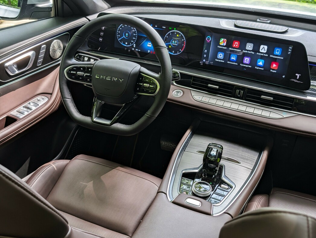 Переступив порог салона, попадаешь в пространство, где эхом отзывается роскошь старшего Tiggo 8 Pro. Безупречная стыковка панелей, тактильно приятные поверхности, мягкий пластик без намека на дешевизну, карбоновые вставки — куда более изящные, чем «а-ля дерево». Цветовое сочетание шоколадного и черного выглядит интересно и дорого. Обращает на себя внимание и черный полоток — это решение внедрили специально по просьбам российских покупателей.