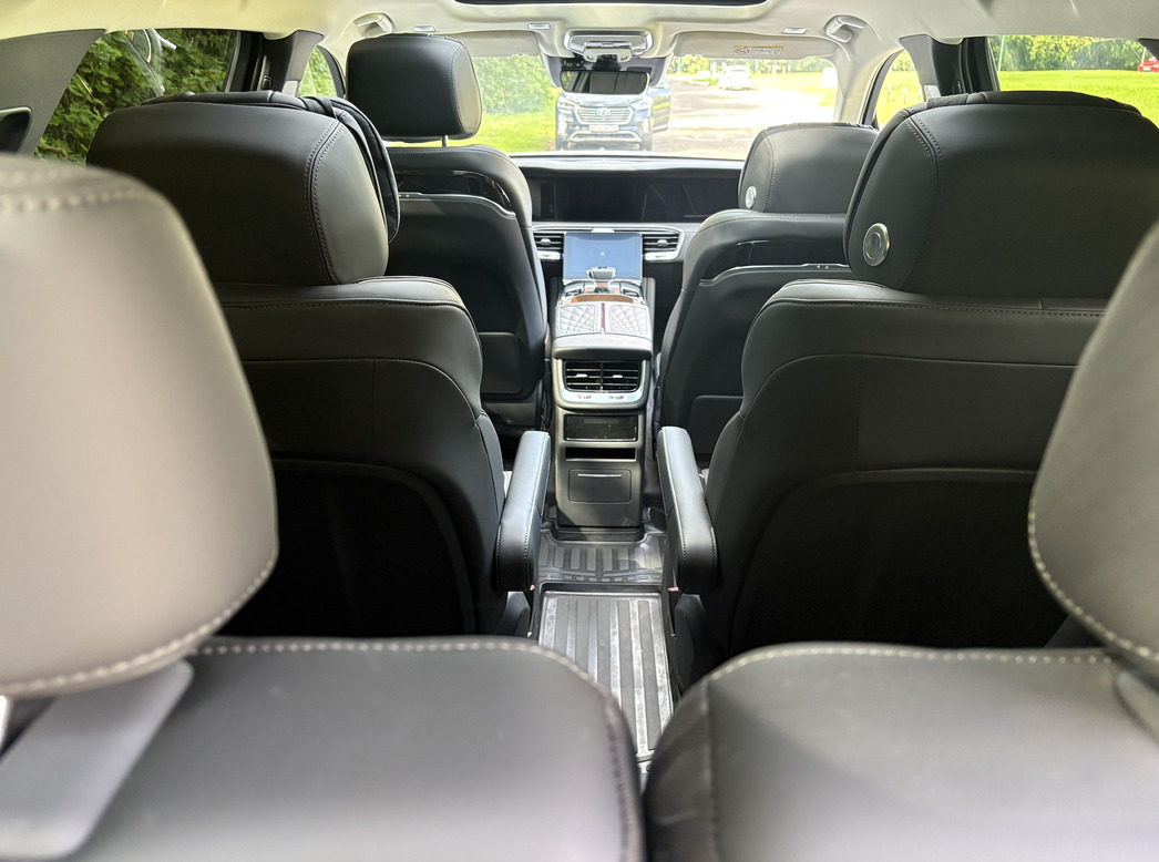 Даже при беглом и поверхностном (как это зачастую и бывает на первом свидании) знакомстве с «внутренним миром» E-HS9, его убранство не поражает изысканностью (чего откровенно ждешь после очарования «фасадом»), хотя и кажется современным и стильным. Да, очень просторно: в полный рост, конечно, не встанешь, но по второму ряду сидений с заходом на «галерку» перемещаешься без проблем.