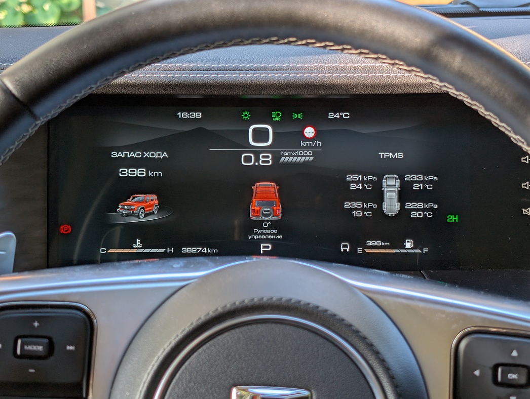 Сердце Tank 300 — бензиновый турбомотор на 2 литра (224 л.с., 387 Нм), в паре с ним работает 8-диапазонный «автомат». Старт со светофора уверенный, тяга доступна с самых низов, коробка переключается плавно и практически незаметно. Но этот силовой агрегат создавался явно не для спринтов, а для марафонов (например, путешествий) или бездорожья, где важна не мощность, а тяга.