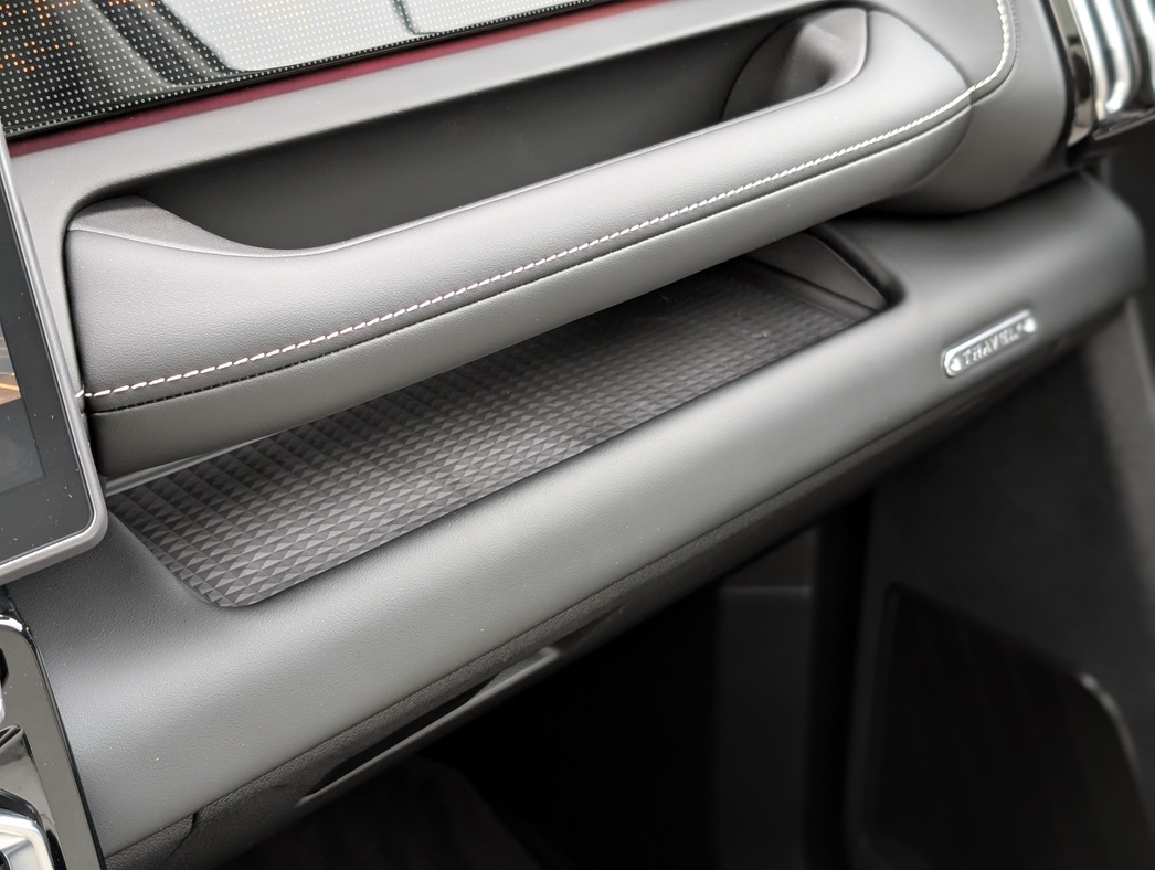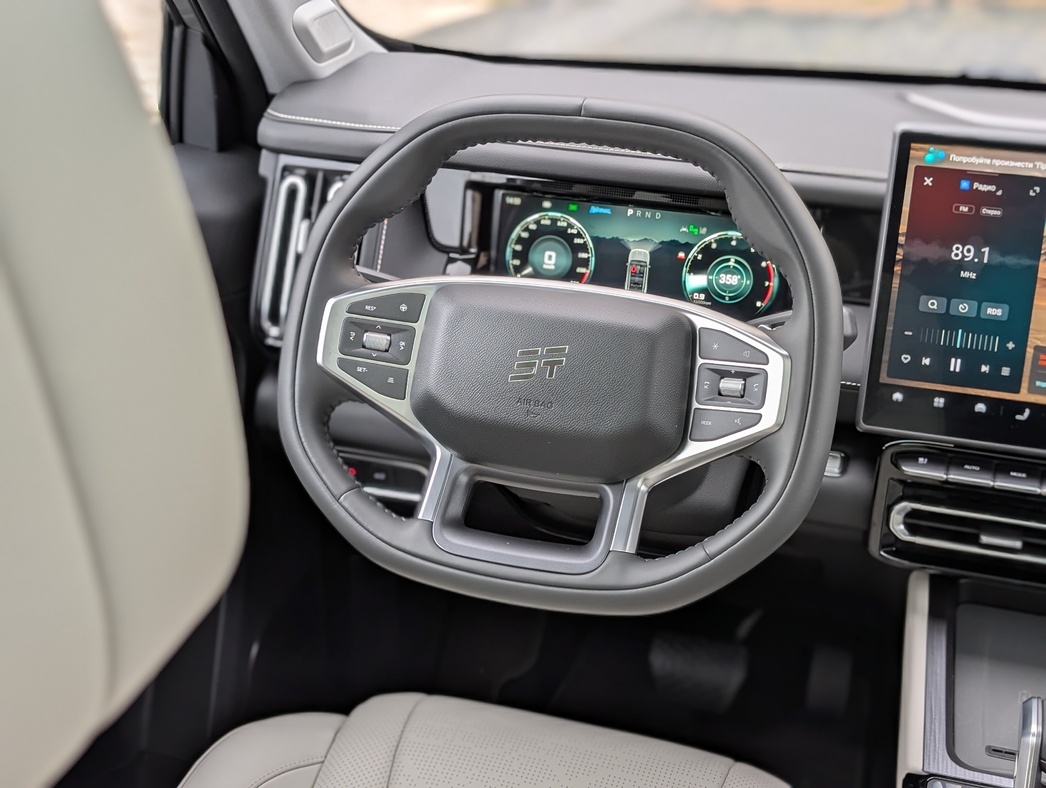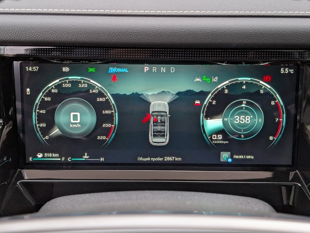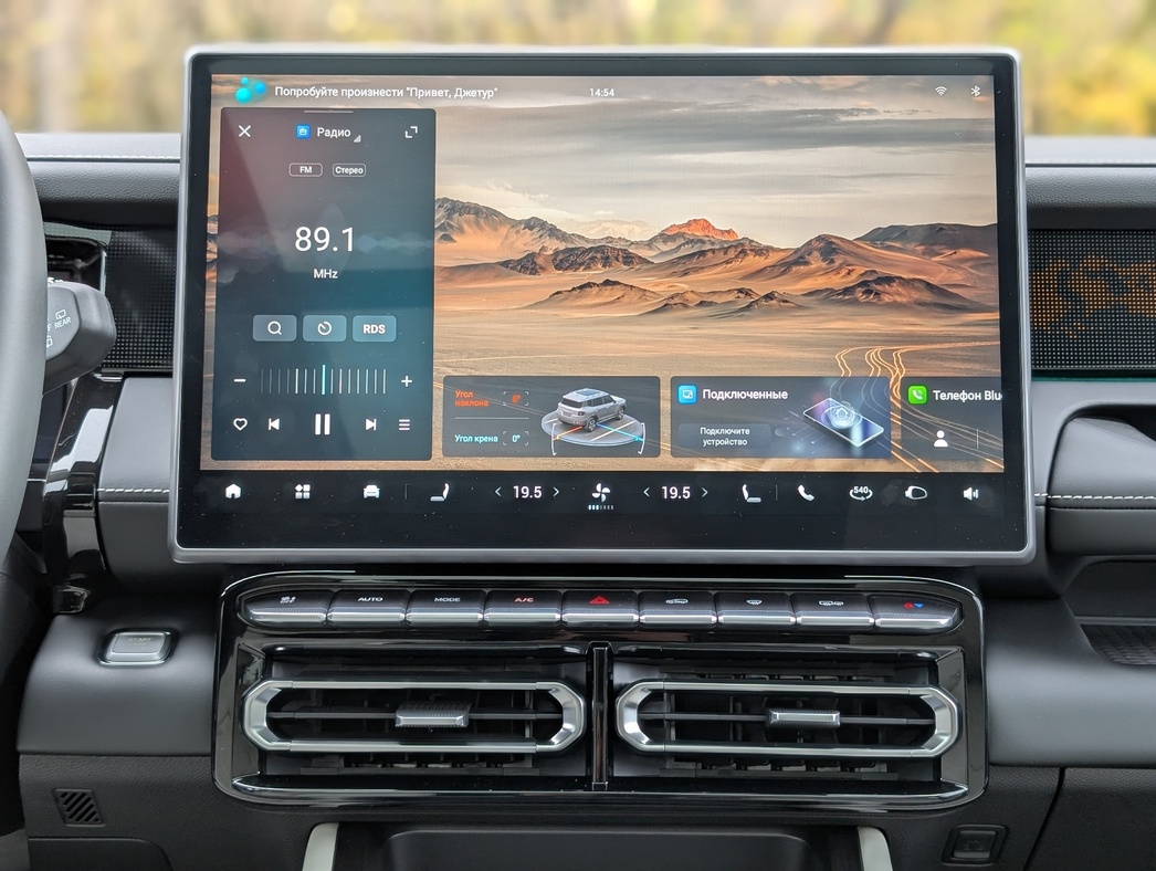 «Баранка» и удобный рычаг АКП со странно расположенной на нем кнопкой «Р» переехали сюда из Т2, как и шайба выбора режимов движения, которых, напомним, в обеих моделях по семь. Да и вообще интерьерно Т1 и Т2 обоснованно и более чем ожидаемо похожи до неразличимости. И тут, и там лаконичная — ничего лишнего — «прямоугольная» архитектура передней панели: цифровая «приборка» на 10,25 дюйма и центральный сенсорный экран диагональю 15,6 дюймов.