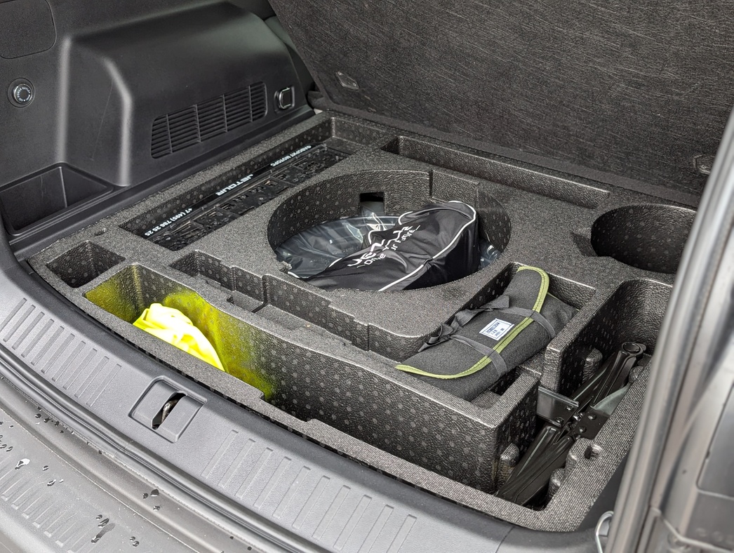 Объем грузового отсека T1 составляет 574 л, что всего на шесть литров меньше, чем у T2. Разница «трюмов» заключается в оснащении. В T1 применен более практичный подход: отсутствуют шторка отсека, сетки и различные держатели. То есть багажное отделение представляет собой просто багажное отделение: строго функциональное пространство с парой боковых пластиковых карманов, такелажными петлями и розеткой на 12 вольт. Впрочем, что-то я слишком увлекся «бытовухой»: пора и за руль.