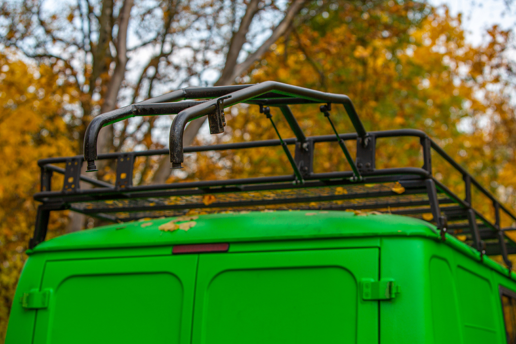 Однако о конкретной тестовой машине есть что сказать. У нас была «лимитка» 330995-500-04 «65 лет», построенная на базе СГР «Комби» на семь мест. Здесь и покраска «раптором» выжигающего зрачки зеленого цвета, и «намордник» силового бампера, напоминающий хоккейную маску вратаря, и лебедка RedBTR, и мощный экспедиционный багажник на крыше, и лесенка, и задний силовой бампер с «калиткой» для запасного колеса. Одним словом, все необходимое, чтобы покорить бездорожье.