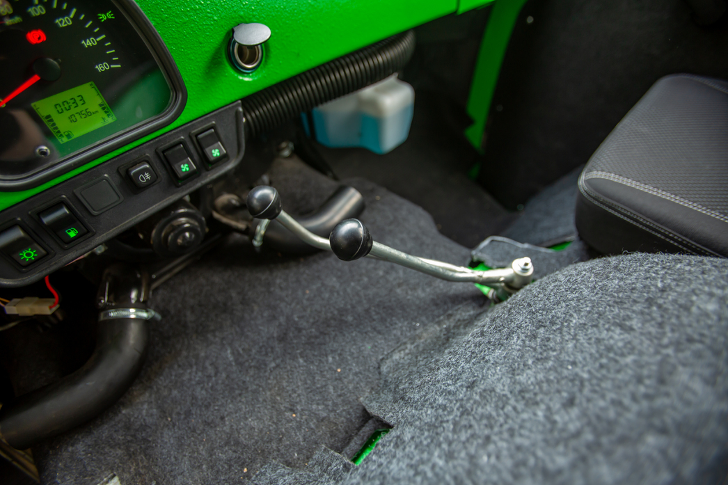 Посадка — крайне неудобная, расположиться «по-автомобильному» невозможно, приходится постоянно наклоняться к лобовому стеклу. Правой руке объективно не хватает длины, а левый локоть предательски ударяется о стекло, набивая раз за разом синяк. Набор клавиш — специфический: свет, обогрев, переключение топливных баков. Последних два: один — на 55 литров, второй — на 30. С учетом немалого, будем честны, расхода — не менее 12-13 литров в городе — актуально.