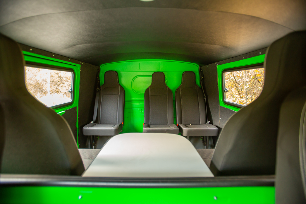 Небогатый, скажем вежливо, ассортимент приборов, представленный единственной шкалой в центре, немногословен, а торчащие патрубки печки не справляются с созданием «погоды в доме». Печек, кстати, тоже две: для пассажиров заднего ряда — отдельная. За спиной у водителя еще и полноценный стол, за которым можно и дичь разделать, и штабное совещание провести, и мотор, расположенный прямо между шофером и передним седоком, отремонтировать.