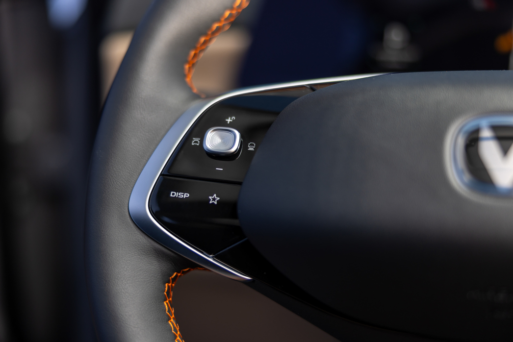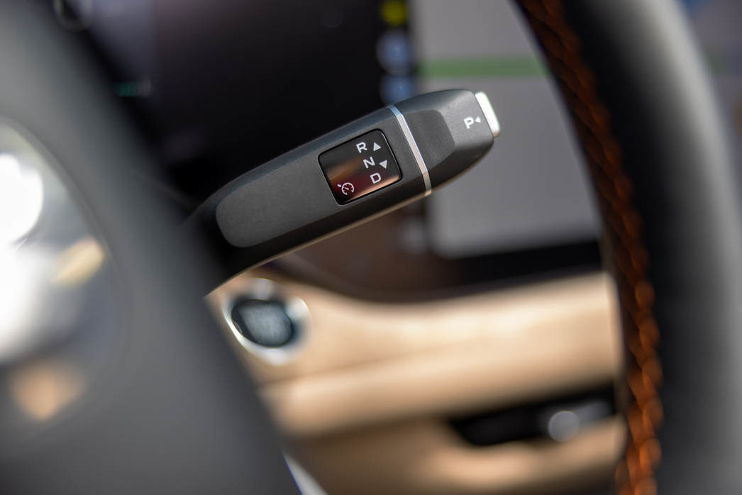 Порой забываешь и том, что селектор коробки передач тут не в традиционном месте, а под рулевой колонкой. Поначалу это даже вызывает лёгкий ступор: рука тянется к центральному тоннелю и находит там пустоту. Но довольно быстро осваиваешься, одобряя такое решение. Освободившееся пространство заняли подстаканники и площадка для пары смартфонов — левая половина с беспроводной зарядкой мощностью 50 Вт с охлаждением. Она, кстати, реально «напитывает» мобильник быстро, и телефон при этом не превращается в раскалённую сковородку — проверяли специально.