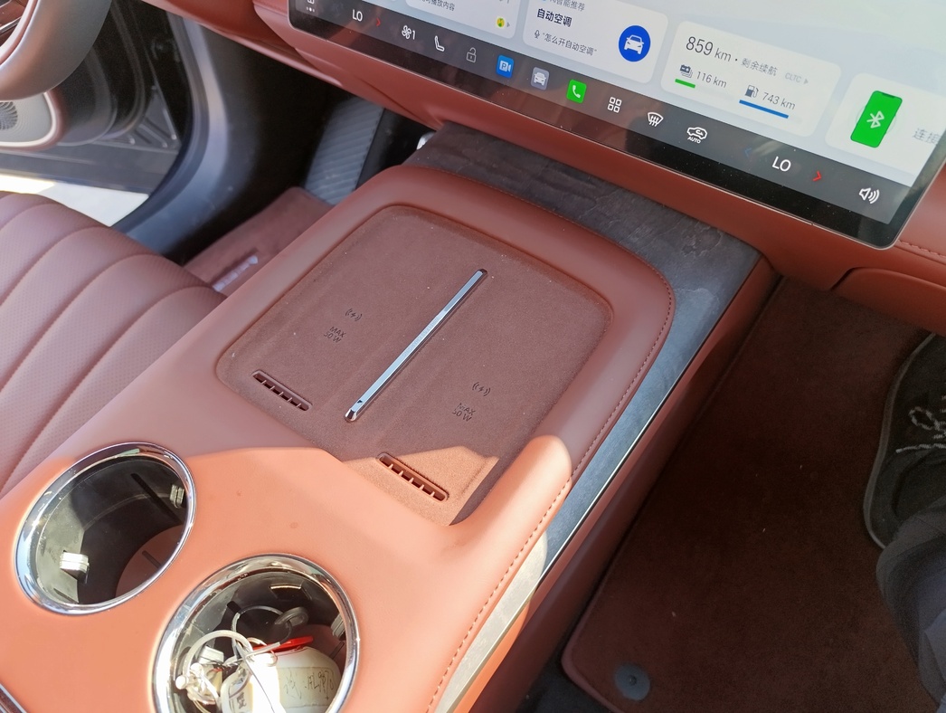 Сажусь в кресло водителя. Тут все знакомо. Такое ощущение, что принципы построения архитектуры салона уже стали стандартом для всего китайского автопрома. Минимум физических кнопок, огромный экран в центре, цифровая приборка и пара индукционных зарядок для телефонов на передней панели. Материалы отделки — кожа, мягкий пластик, вставки под дерево. Выглядит богато, на ощупь тоже все хорошо, да и по оснащению претензий нет.