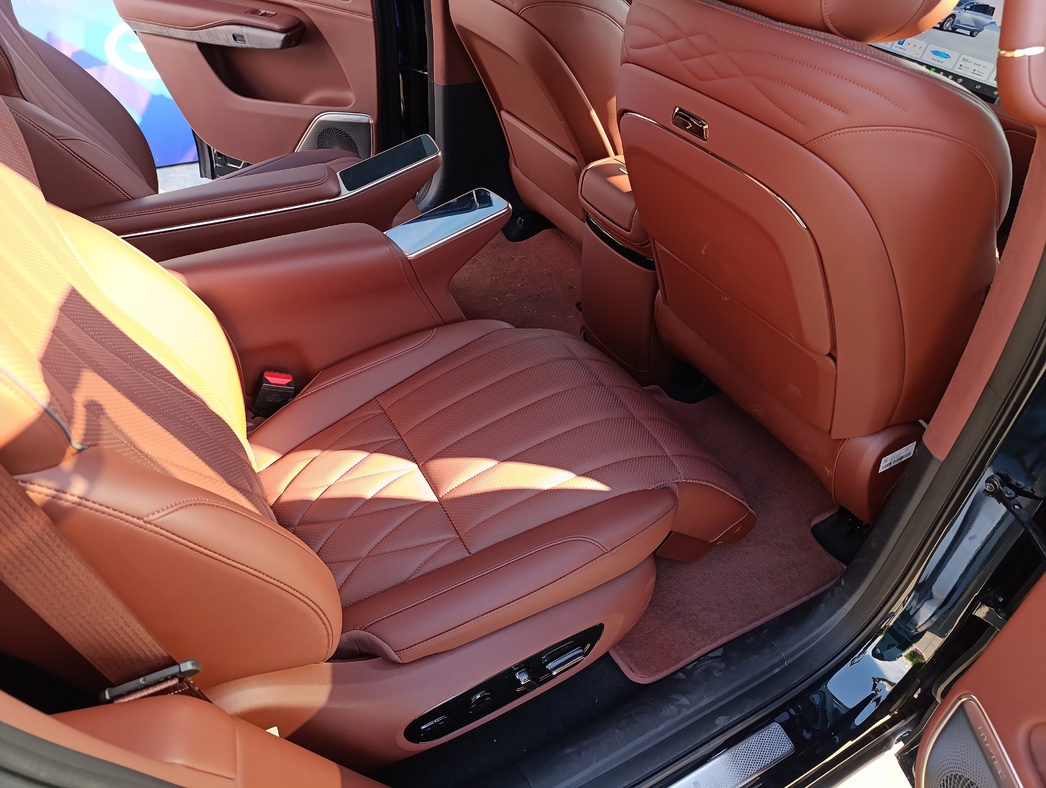 Перед тем как тронуться, оцениваю задний ряд. Тут он главный. Есть два раздельных кресла с электрорегулировками, вентиляцией, массажем и оттоманками. Однако пространства для ног хотелось бы иметь чуть больше. Под потолком — большой монитор. В общем, не хуже, чем у конкурентов. Про третий ряд особо сказать нечего. Он есть — и на том спасибо. Места не слишком много, хватит разве что для детей.